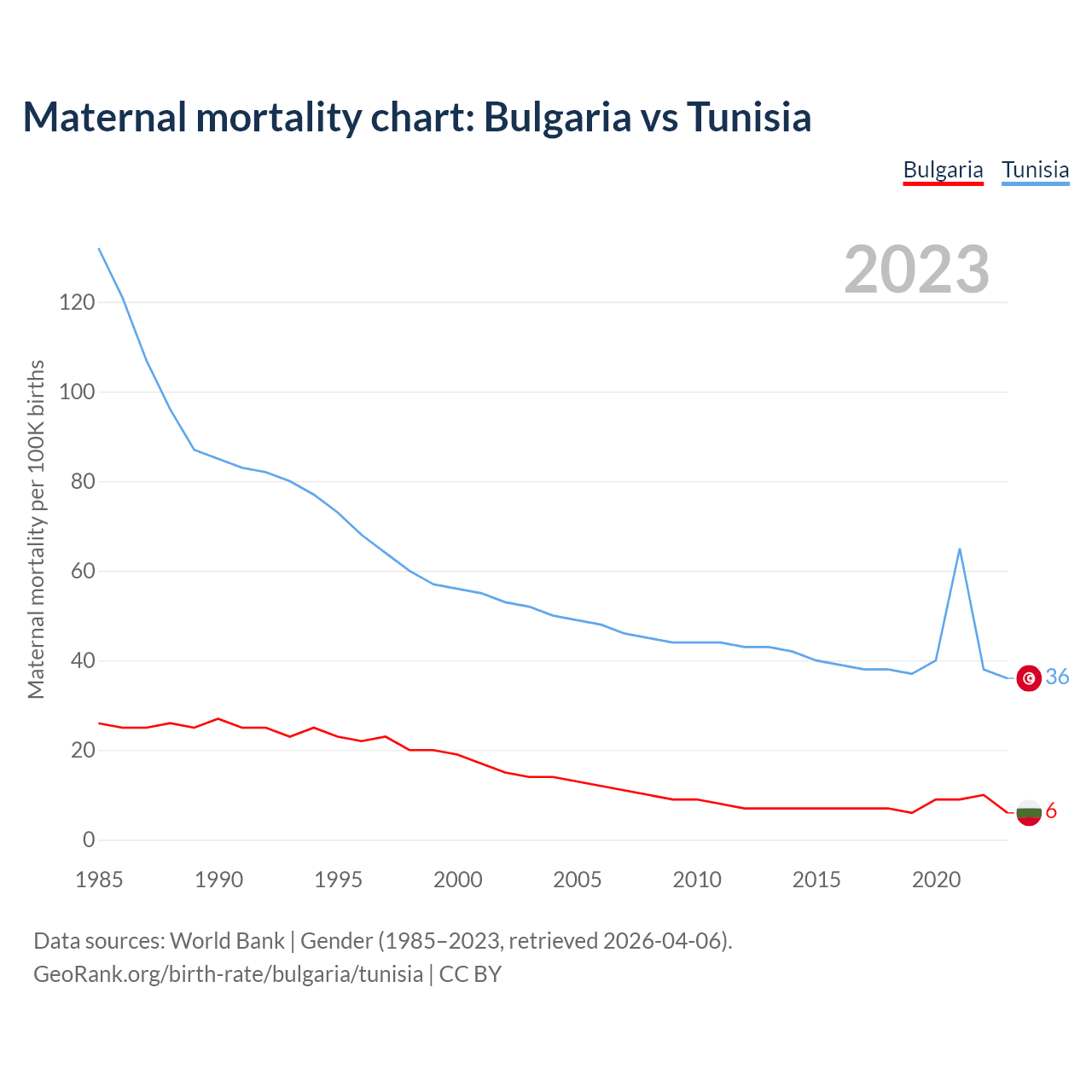 The maternal mortality rate, which is the probability of dying during childbirth or within 42 days of pregnancy termination, is 6 deaths per 100,000 live births in Bulgaria, compared to 36 deaths in Tunisia.