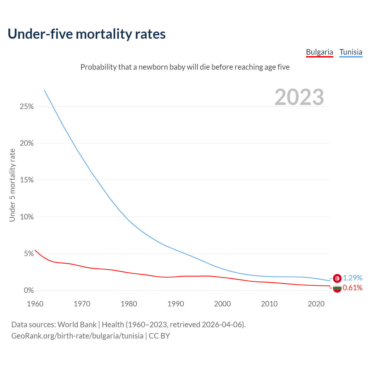 The chance that a newborn baby will die before reaching age five is 0.61% in Bulgaria and 1.29% in Tunisia. Above is a chart with historical data on under-five mortality rates.