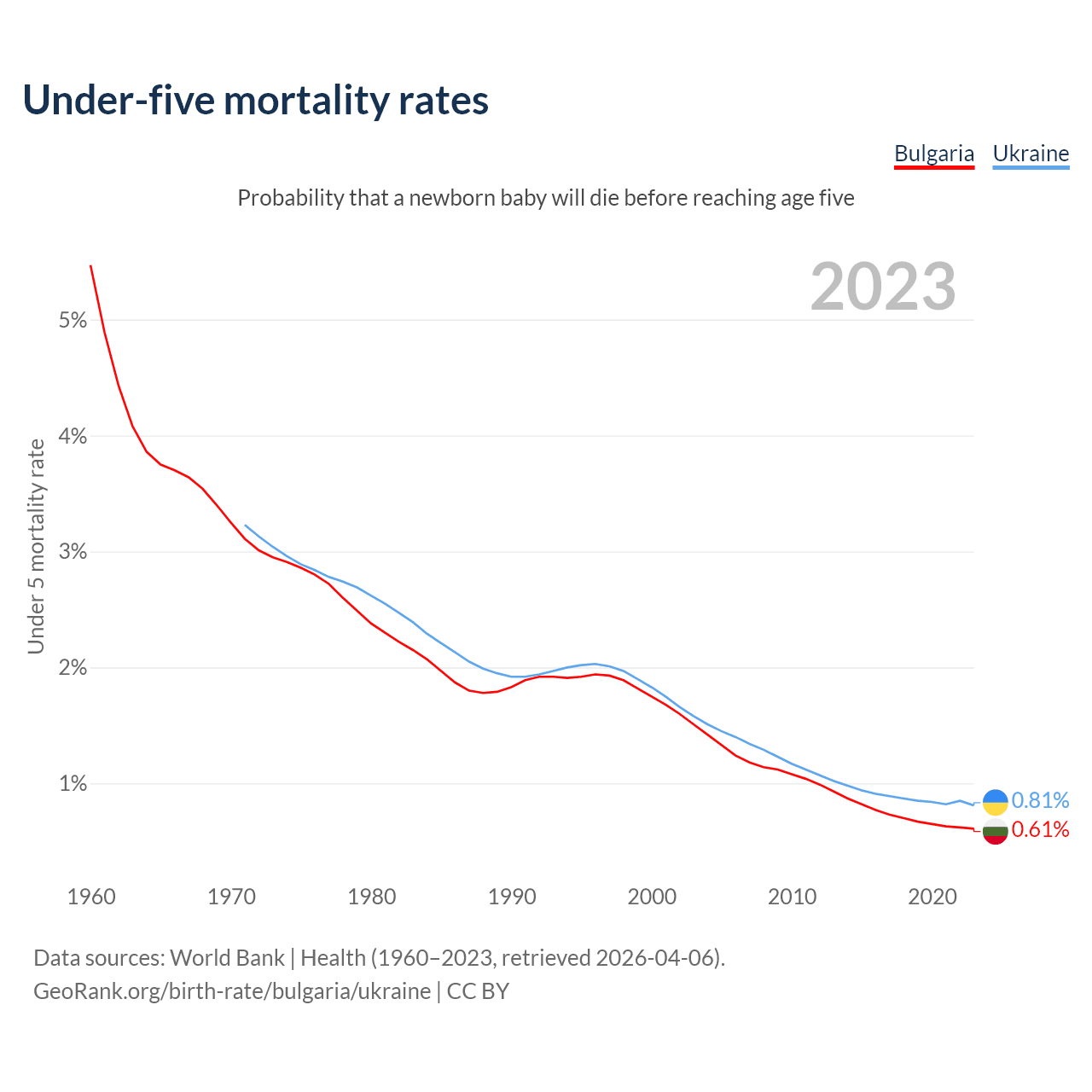 The chance that a newborn baby will die before reaching age five is 0.61% in Bulgaria and 0.81% in Ukraine. Above is a chart with historical data on under-five mortality rates.