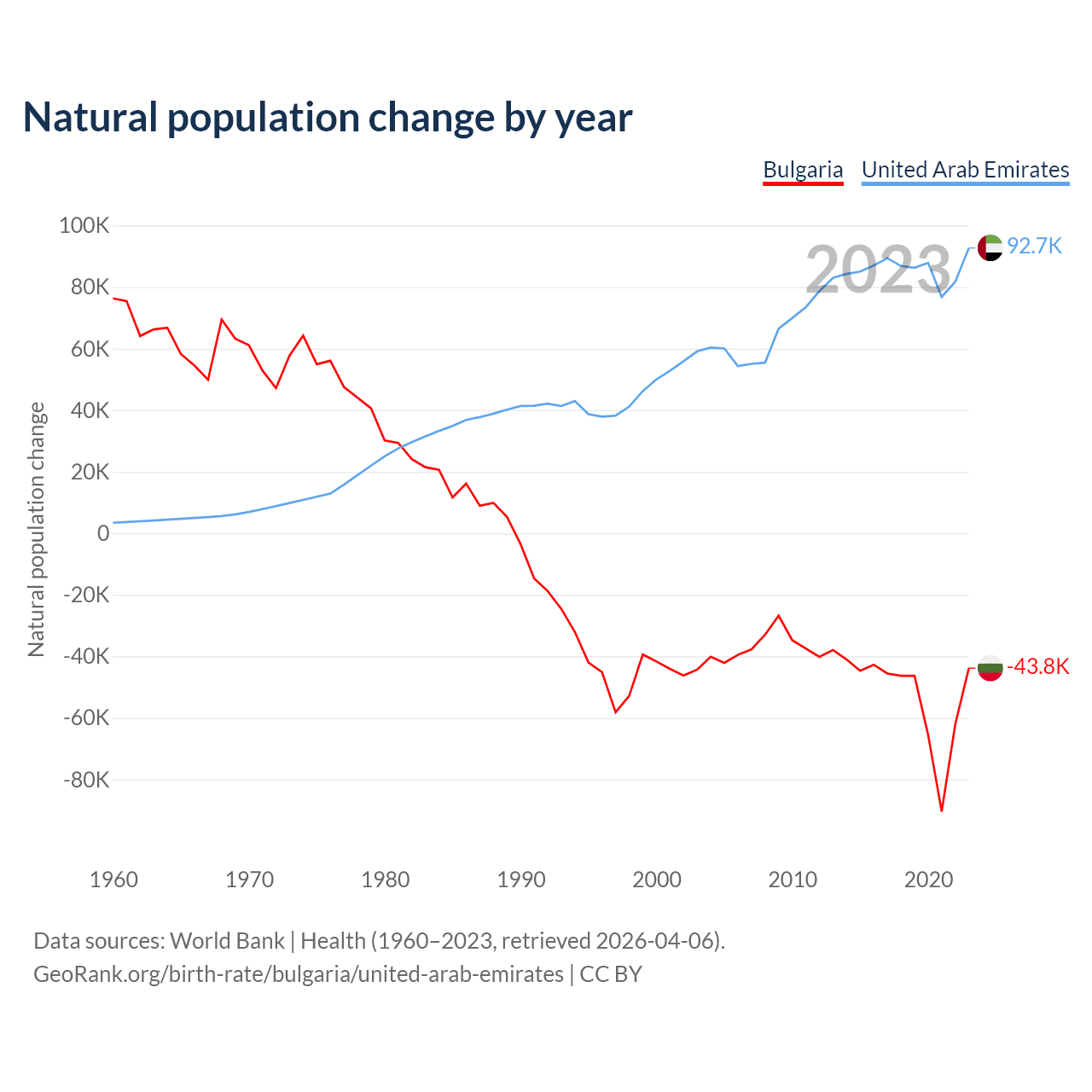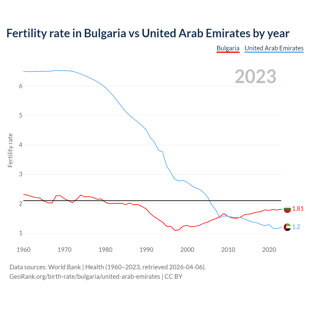 Bulgaria has an annual birth rate of 8.9 births per 1,000 people, compared to 9.77 for the United Arab Emirates. The average number of children a woman is expected to have during her lifetime — the fertility rate, is 1.81 in Bulgaria and 1.2 in the United Arab Emirates — 33.7% difference.