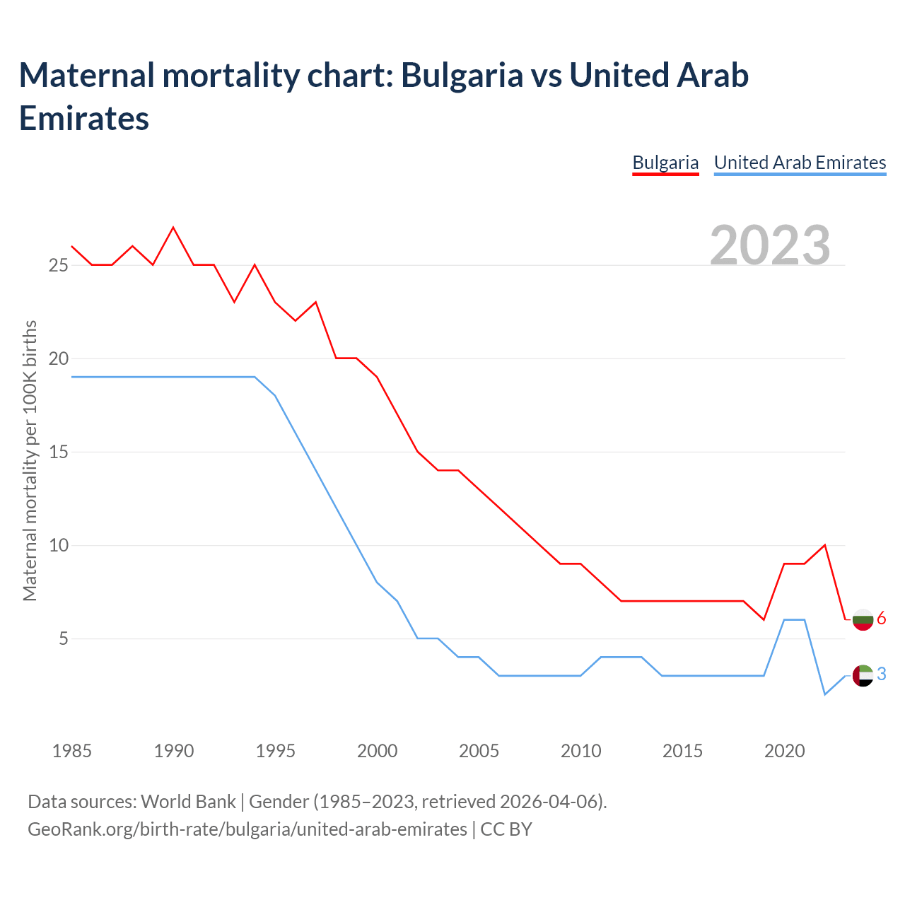 The maternal mortality rate, which is the probability of dying during childbirth or within 42 days of pregnancy termination, is 6 deaths per 100,000 live births in Bulgaria, compared to 3 deaths in the United Arab Emirates.