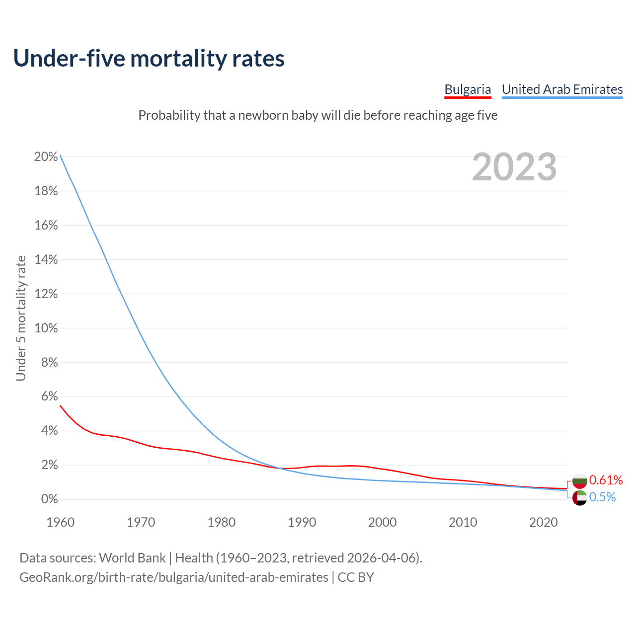 The chance that a newborn baby will die before reaching age five is 0.61% in Bulgaria and 0.5% in the United Arab Emirates. Above is a chart with historical data on under-five mortality rates.