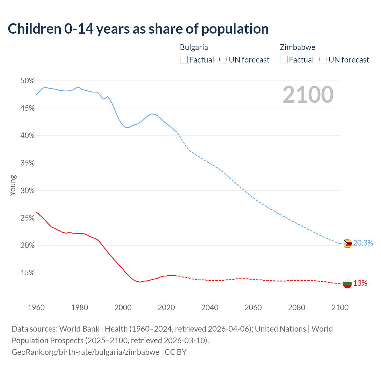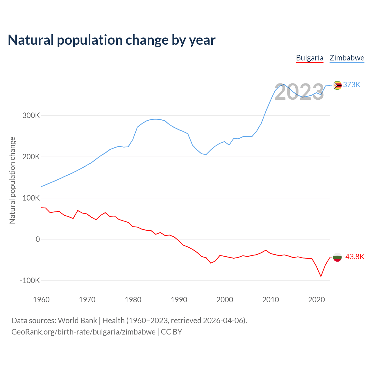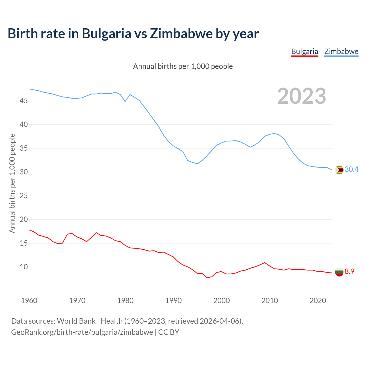 Bulgaria has an annual birth rate of 8.9 births per 1,000 people, compared to 30.4 for Zimbabwe. The average number of children a woman is expected to have during her lifetime — the fertility rate, is 1.81 in Bulgaria and 3.72 in Zimbabwe — 105.7% difference.