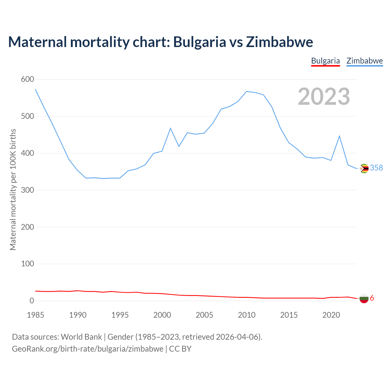 The maternal mortality rate, which is the probability of dying during childbirth or within 42 days of pregnancy termination, is 6 deaths per 100,000 live births in Bulgaria, compared to 358 deaths in Zimbabwe.