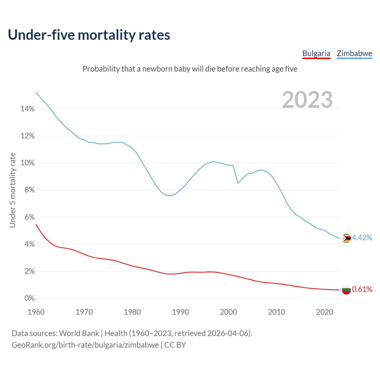 The chance that a newborn baby will die before reaching age five is 0.61% in Bulgaria and 4.42% in Zimbabwe. Above is a chart with historical data on under-five mortality rates.