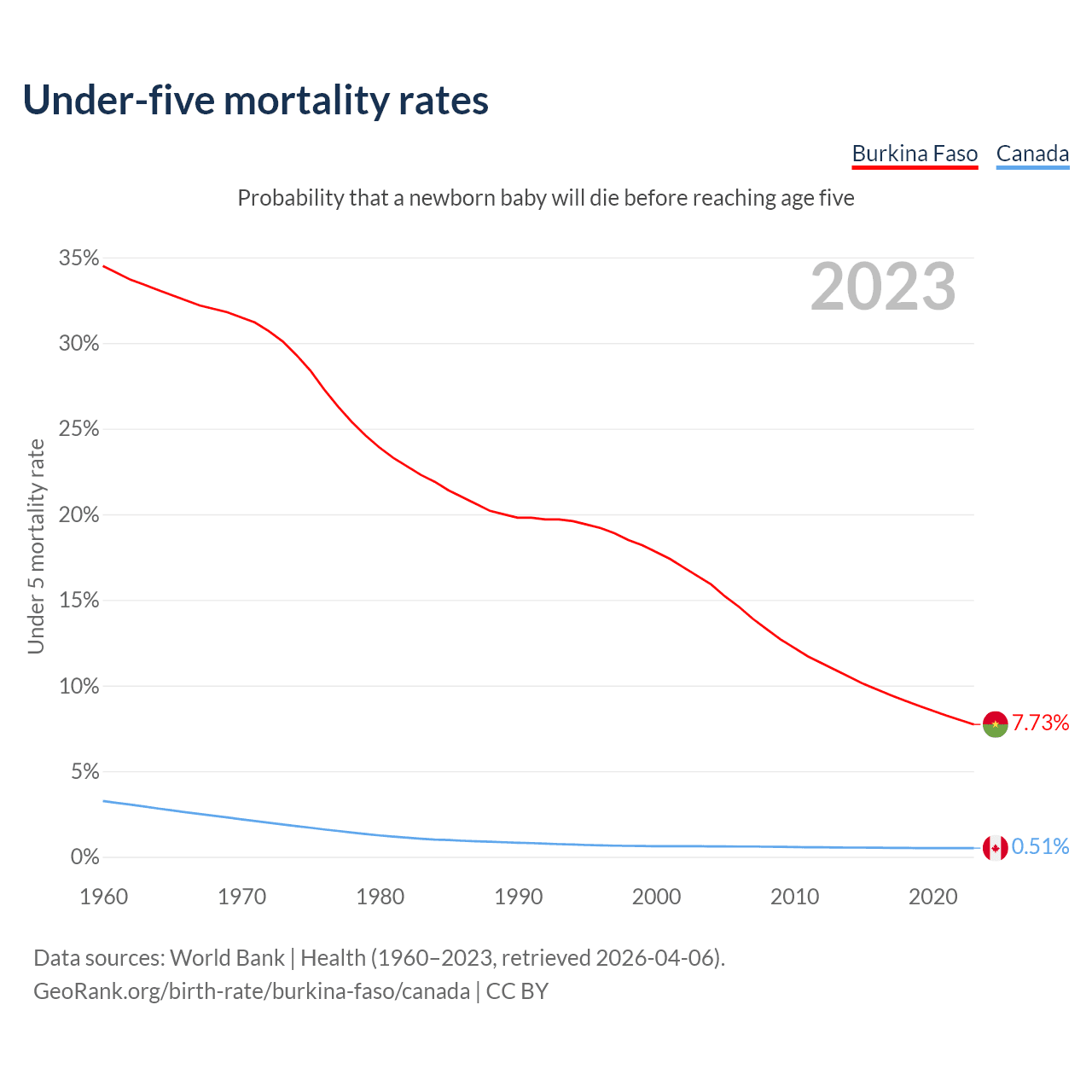 The chance that a newborn baby will die before reaching age five is 7.73% in Burkina Faso and 0.51% in Canada. Above is a chart with historical data on under-five mortality rates.