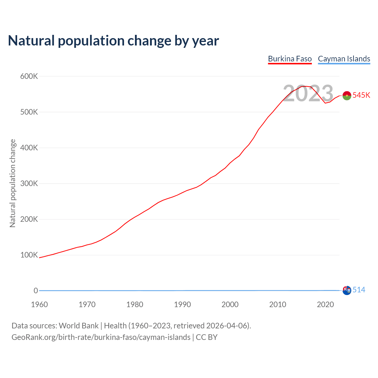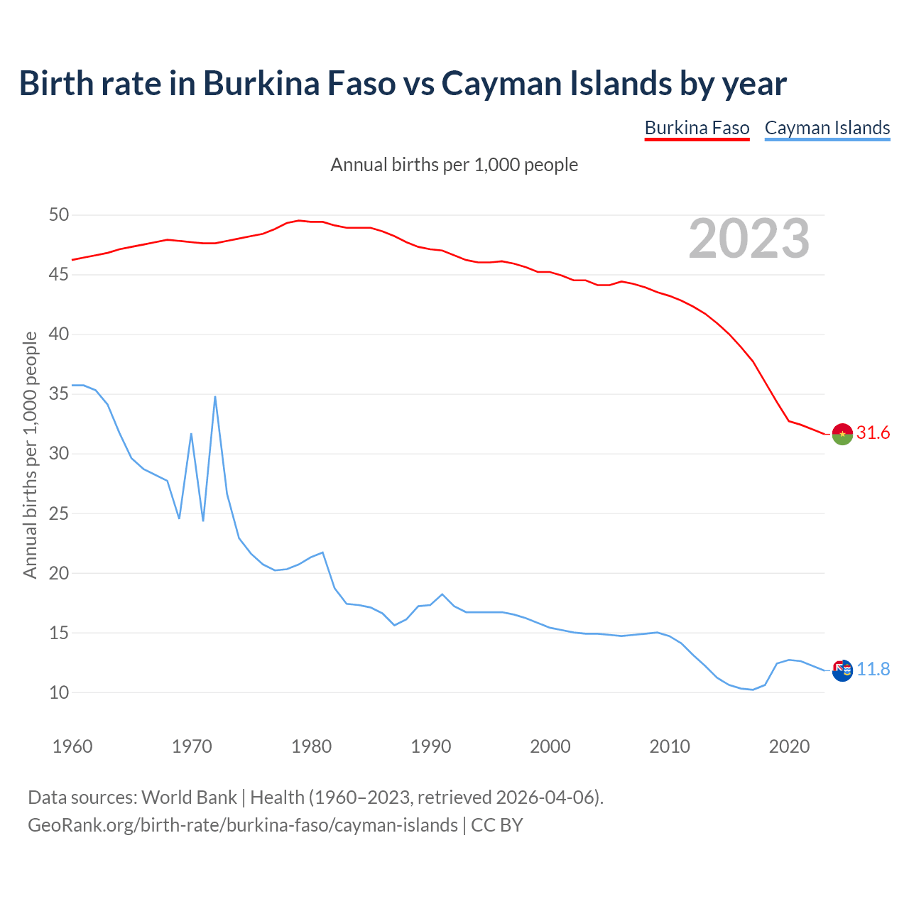 Burkina Faso has an annual birth rate of 31.6 births per 1,000 people, compared to 11.8 for the Cayman Islands. The average number of children a woman is expected to have during her lifetime — the fertility rate, is 4.19 in Burkina Faso and 1.53 in the Cayman Islands — 63.4% difference.