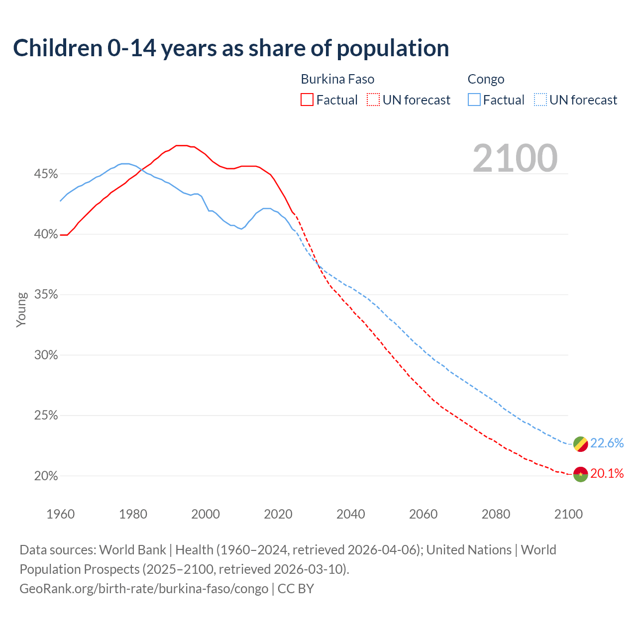 1960 vs 2023, the fertility rate has decreased by 33% in Burkina Faso and by 31.7% in the Congo — in 1960, it was 6.25 and 6.09, respectively.