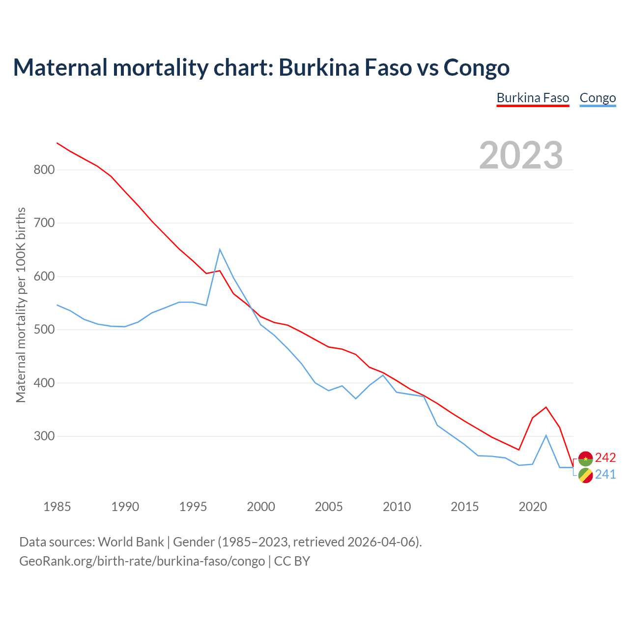 The maternal mortality rate, which is the probability of dying during childbirth or within 42 days of pregnancy termination, is 242 deaths per 100,000 live births in Burkina Faso, compared to 241 deaths in the Congo.