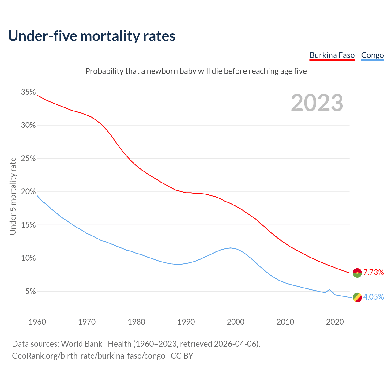 The chance that a newborn baby will die before reaching age five is 7.73% in Burkina Faso and 4.05% in the Congo. Above is a chart with historical data on under-five mortality rates.