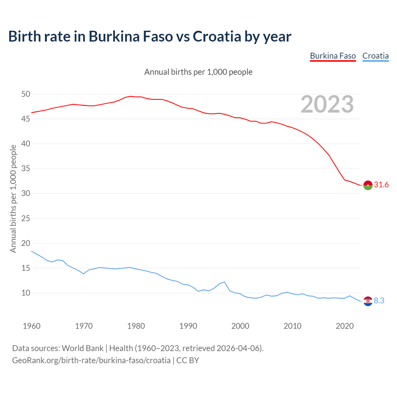 Burkina Faso has an annual birth rate of 31.6 births per 1,000 people, compared to 8.3 for Croatia. The average number of children a woman is expected to have during her lifetime — the fertility rate, is 4.19 in Burkina Faso and 1.46 in Croatia — 65.1% difference.