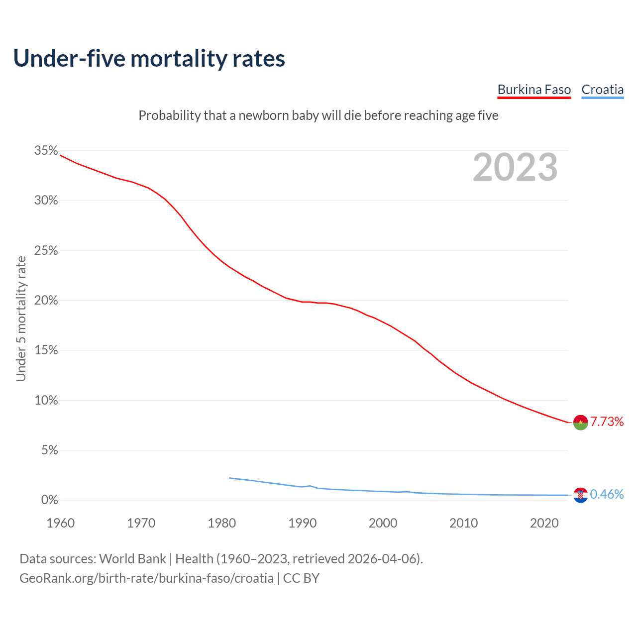 The chance that a newborn baby will die before reaching age five is 7.73% in Burkina Faso and 0.46% in Croatia. Above is a chart with historical data on under-five mortality rates.