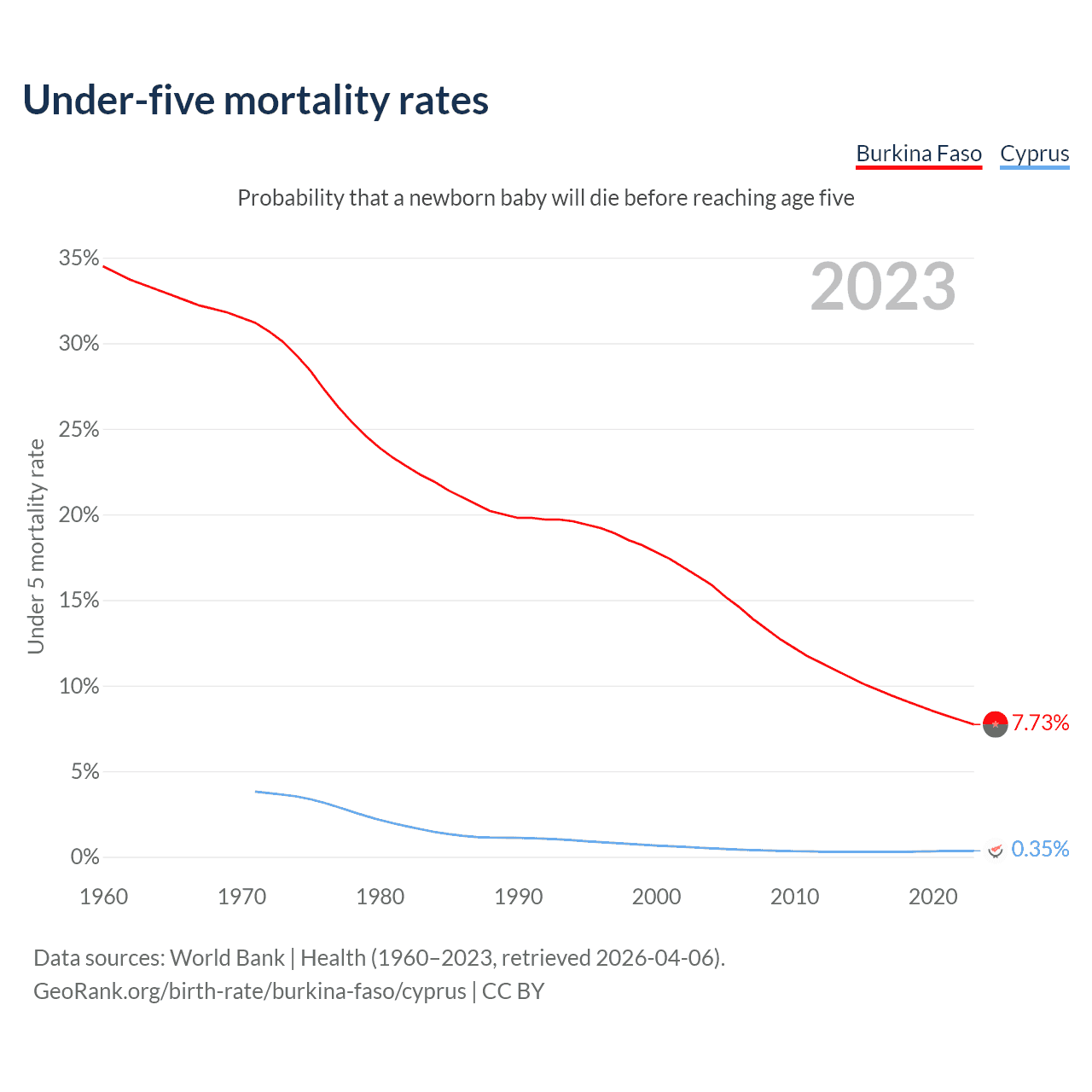 The chance that a newborn baby will die before reaching age five is 7.73% in Burkina Faso and 0.35% in Cyprus. Above is a chart with historical data on under-five mortality rates.