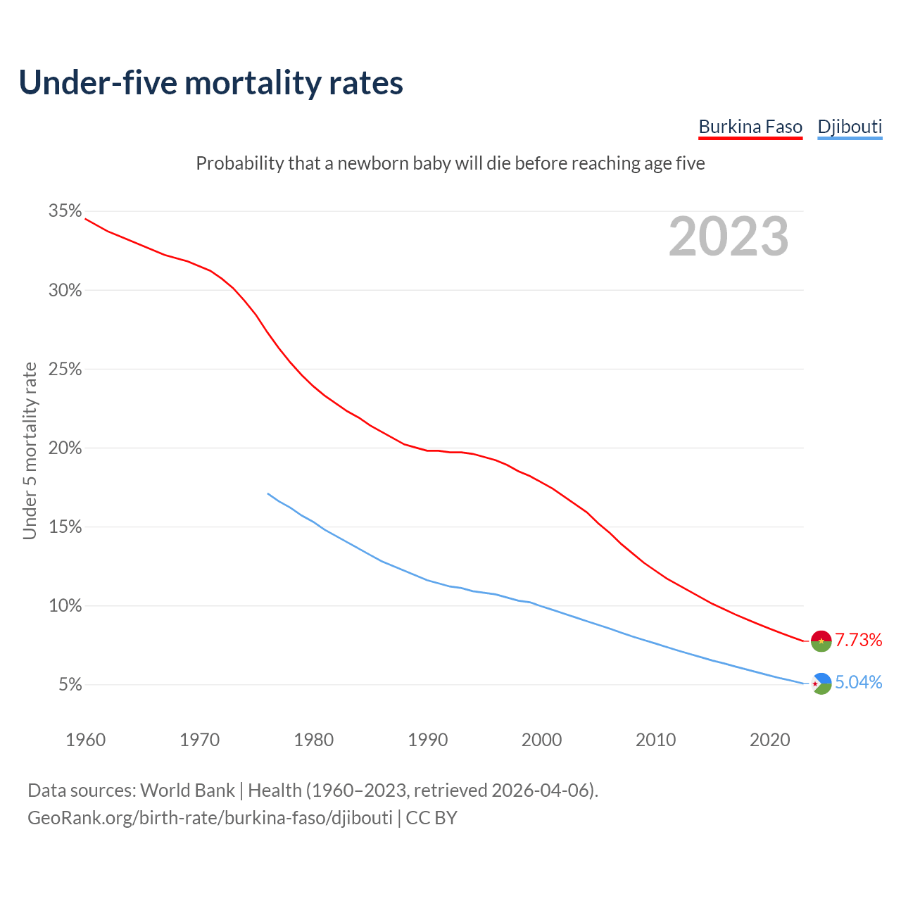 The chance that a newborn baby will die before reaching age five is 7.73% in Burkina Faso and 5.04% in Djibouti. Above is a chart with historical data on under-five mortality rates.