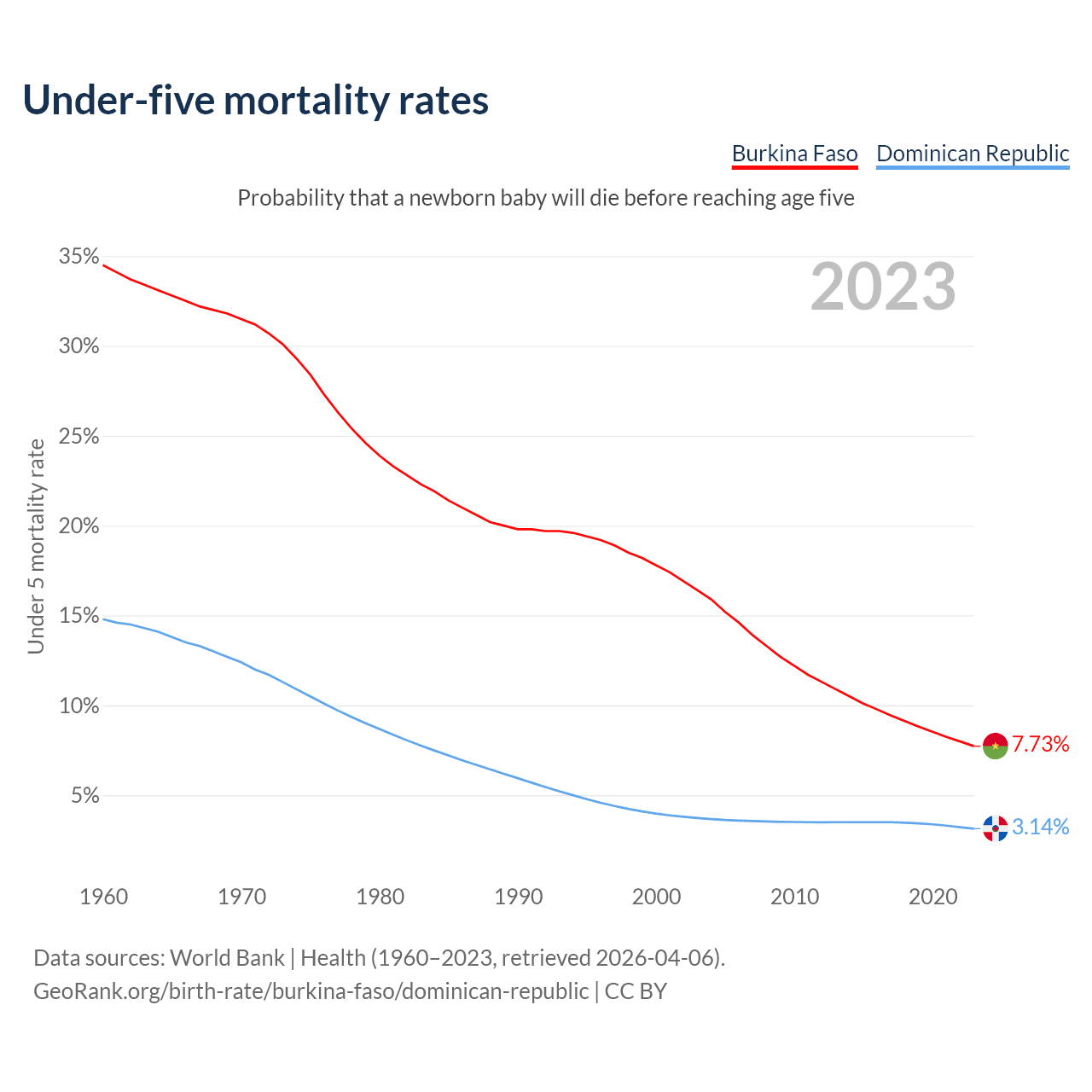 The chance that a newborn baby will die before reaching age five is 7.73% in Burkina Faso and 3.14% in the Dominican Republic. Above is a chart with historical data on under-five mortality rates.