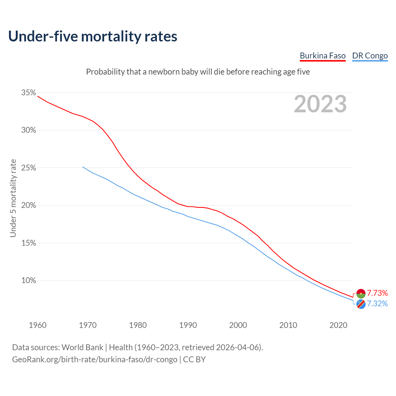 The chance that a newborn baby will die before reaching age five is 7.73% in Burkina Faso and 7.32% in the DR Congo. Above is a chart with historical data on under-five mortality rates.