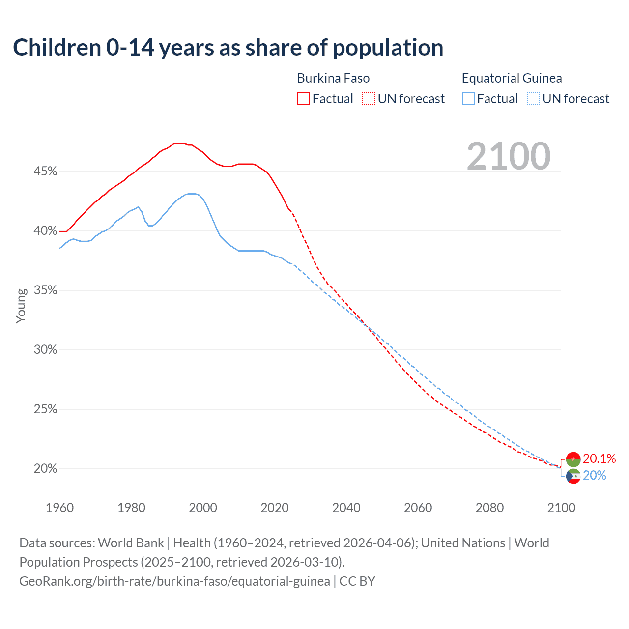 According to the latest available data on birth rates, the fertility rate in Burkina Faso was 4.19 children per woman in 2023, compared to 4.08 in Equatorial Guinea in 2023. The replacement level is considered to be 2.1 children per woman.