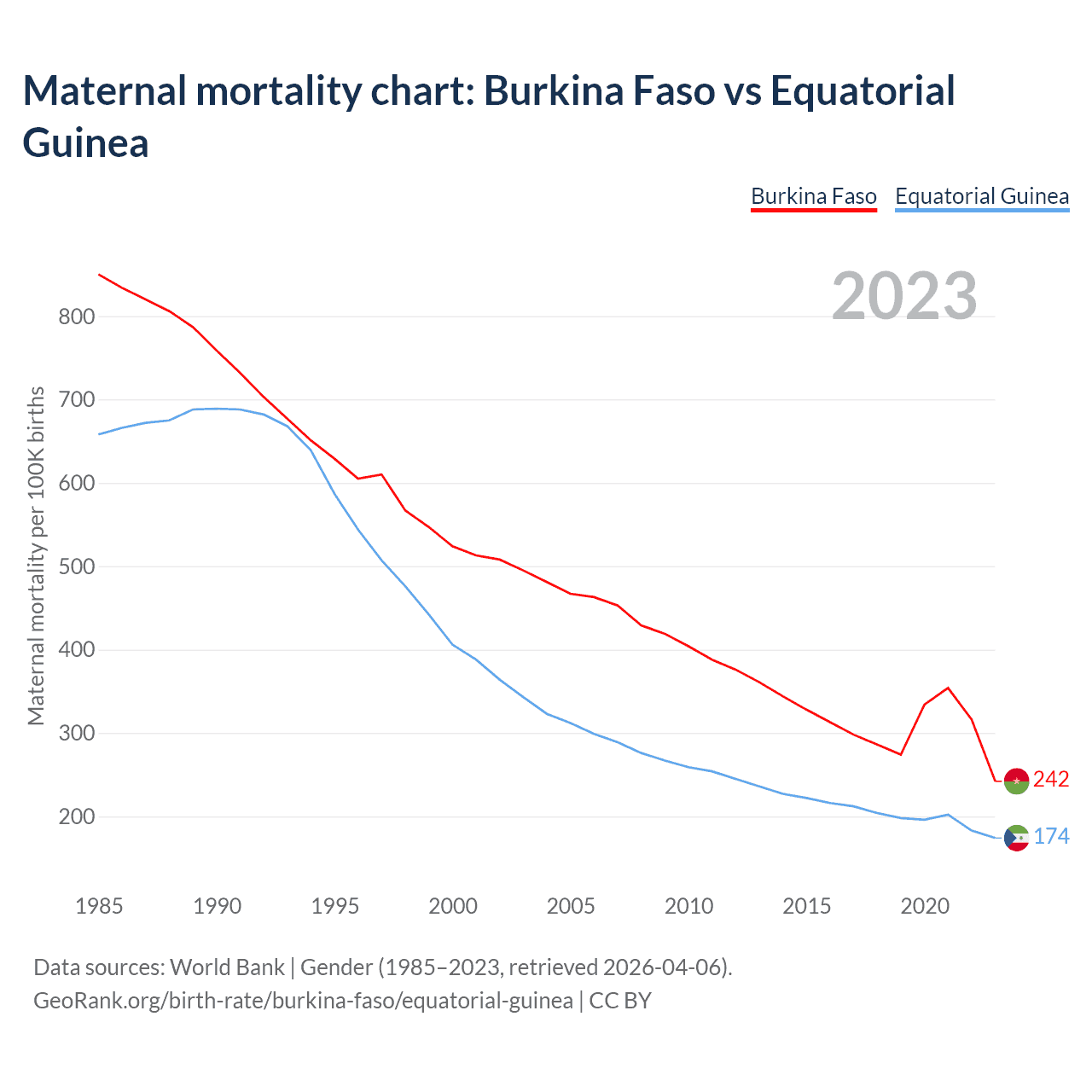 The maternal mortality rate, which is the probability of dying during childbirth or within 42 days of pregnancy termination, is 242 deaths per 100,000 live births in Burkina Faso, compared to 174 deaths in Equatorial Guinea.