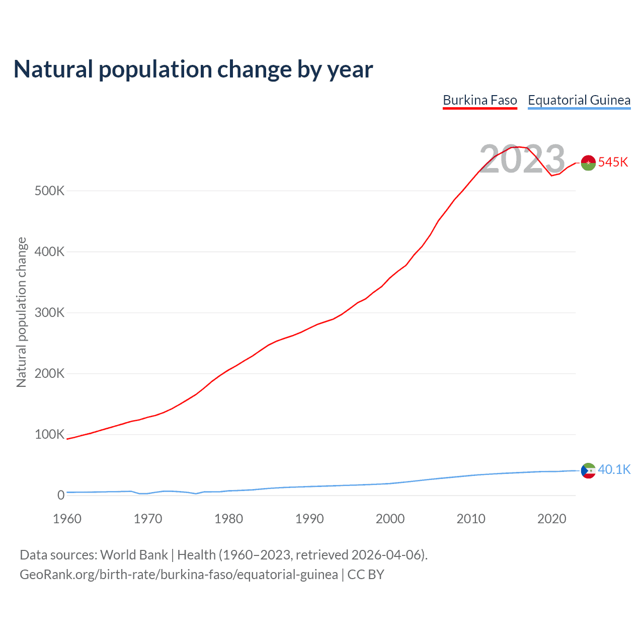 Burkina Faso has an annual birth rate of 31.6 births per 1,000 people, compared to 29.6 for Equatorial Guinea. The average number of children a woman is expected to have during her lifetime — the fertility rate, is 4.19 in Burkina Faso and 4.08 in Equatorial Guinea — 2.51% difference.