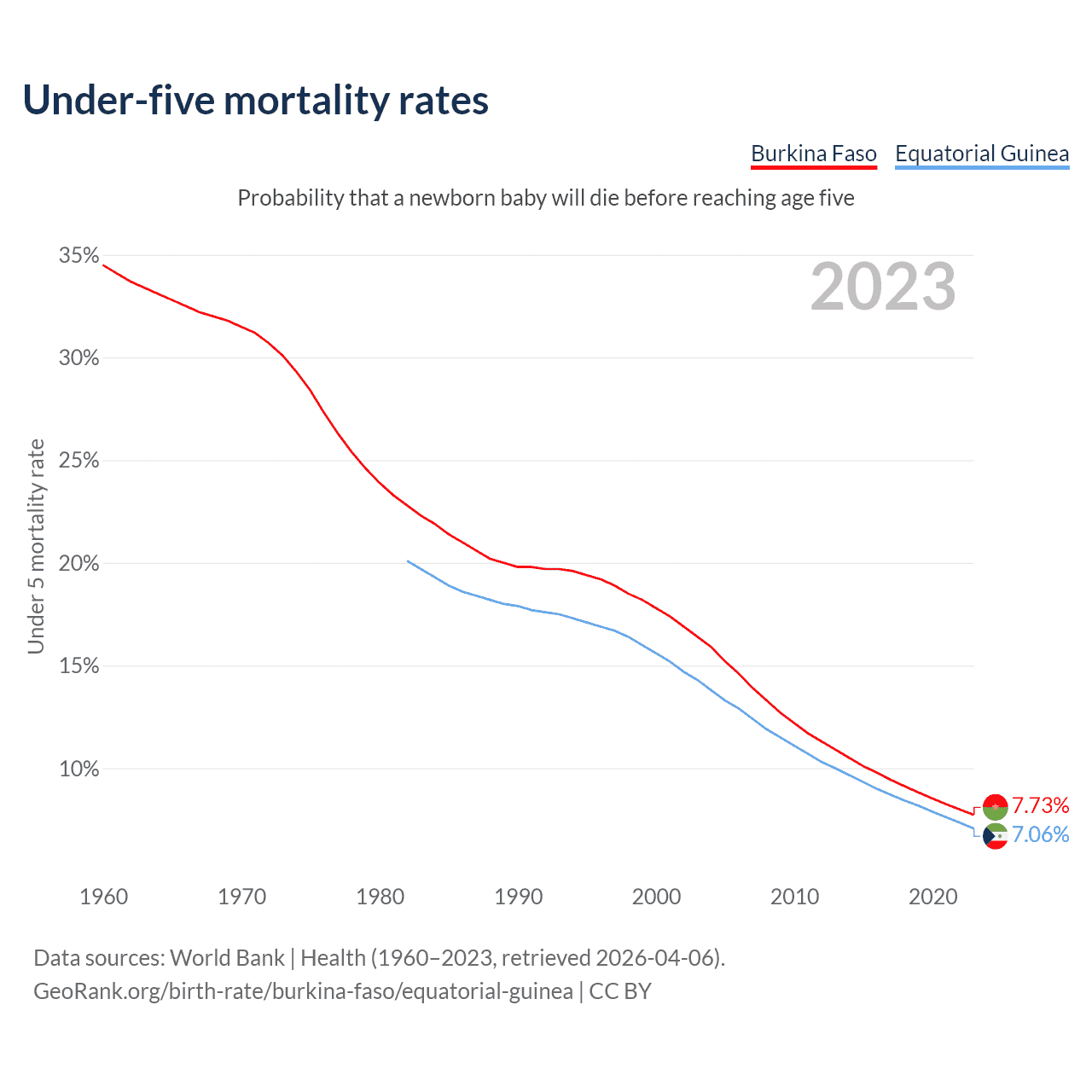 The chance that a newborn baby will die before reaching age five is 7.73% in Burkina Faso and 7.06% in Equatorial Guinea. Above is a chart with historical data on under-five mortality rates.