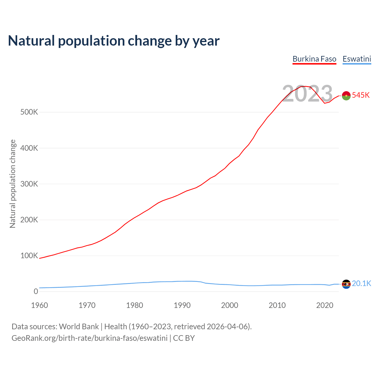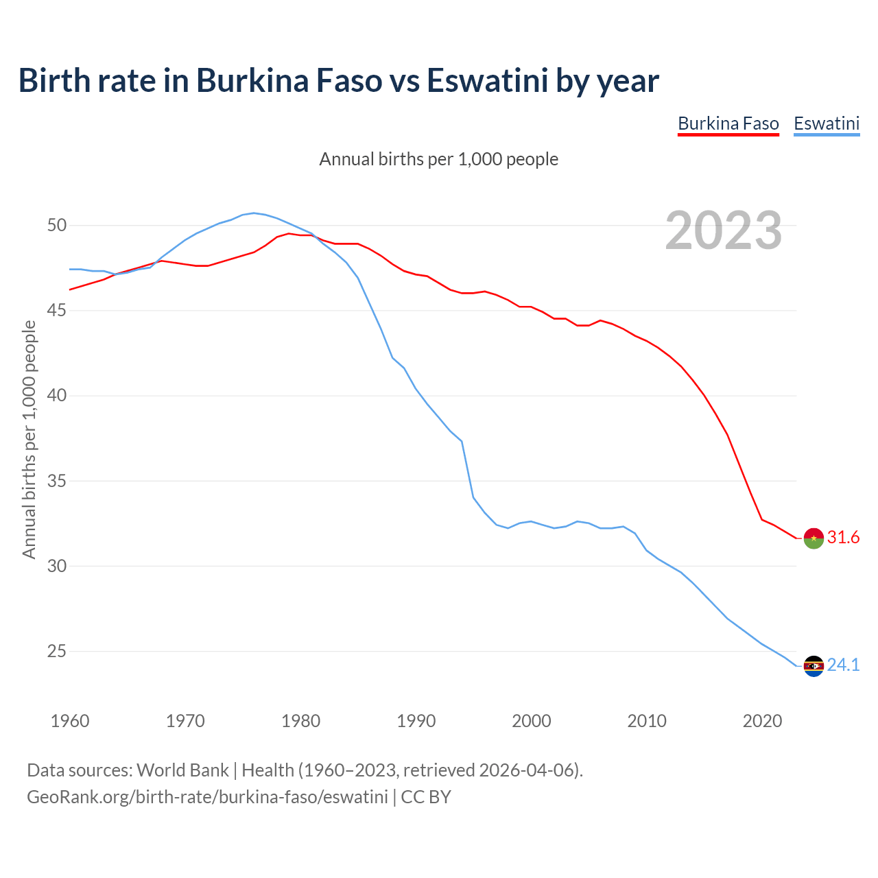 Burkina Faso has an annual birth rate of 31.6 births per 1,000 people, compared to 24.1 for Eswatini. The average number of children a woman is expected to have during her lifetime — the fertility rate, is 4.19 in Burkina Faso and 2.75 in Eswatini — 34.2% difference.