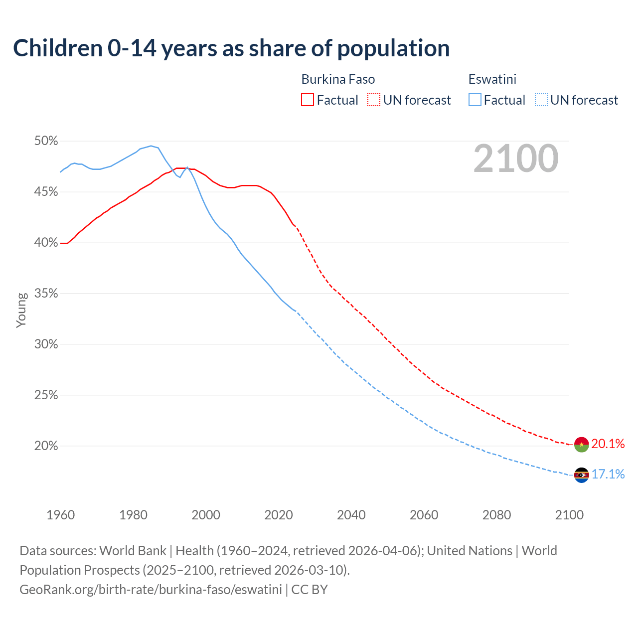 According to the latest available data on birth rates, the fertility rate in Burkina Faso was 4.19 children per woman in 2023, compared to 2.75 in Eswatini in 2023. The replacement level is considered to be 2.1 children per woman.