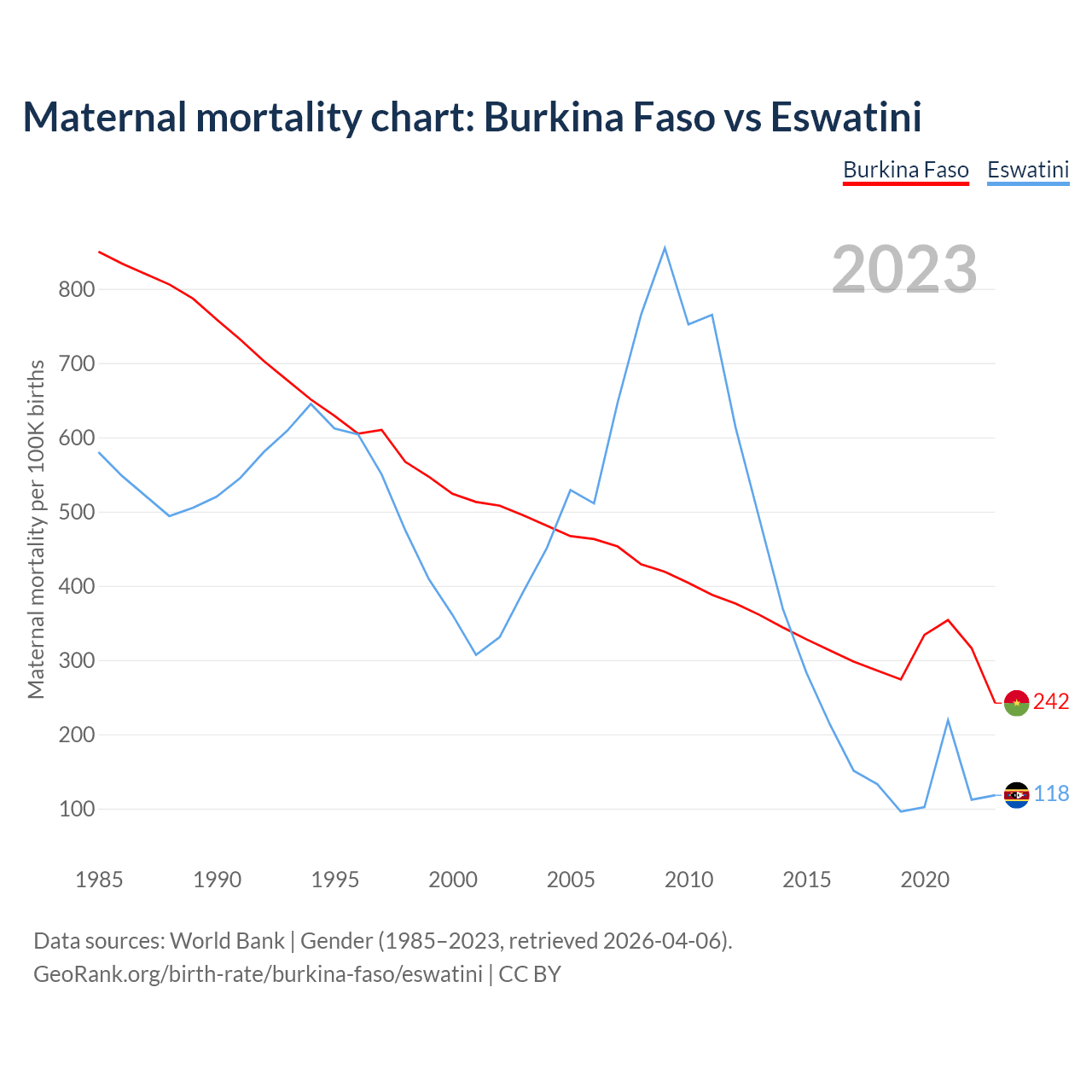 The maternal mortality rate, which is the probability of dying during childbirth or within 42 days of pregnancy termination, is 242 deaths per 100,000 live births in Burkina Faso, compared to 118 deaths in Eswatini.