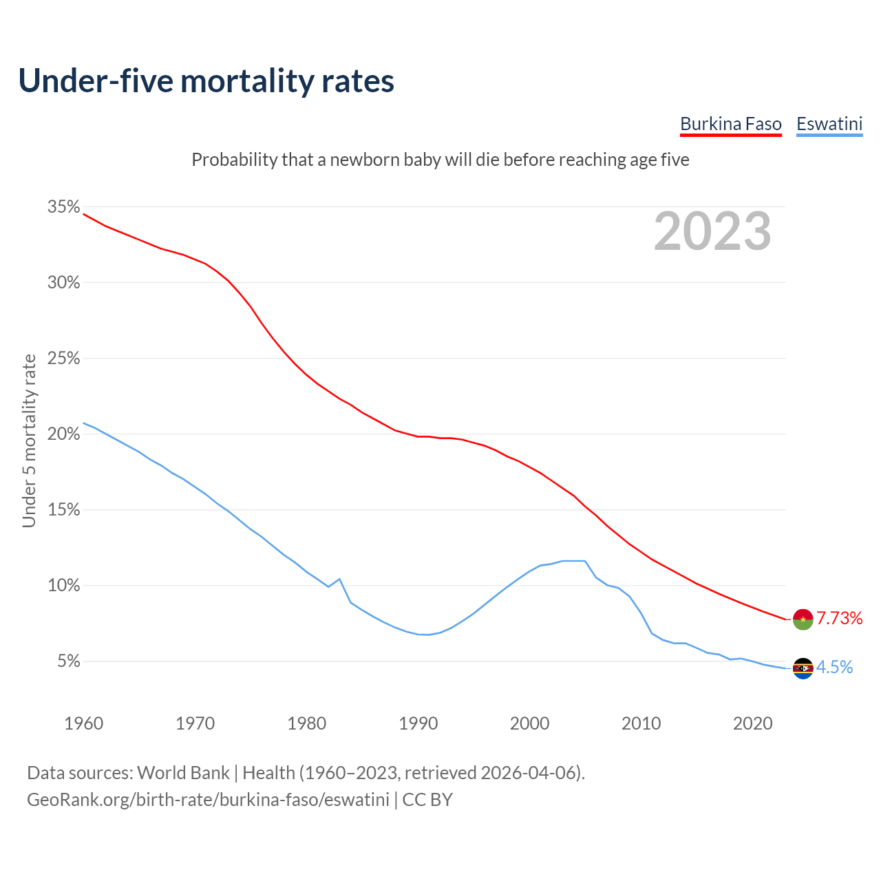 The chance that a newborn baby will die before reaching age five is 7.73% in Burkina Faso and 4.5% in Eswatini. Above is a chart with historical data on under-five mortality rates.