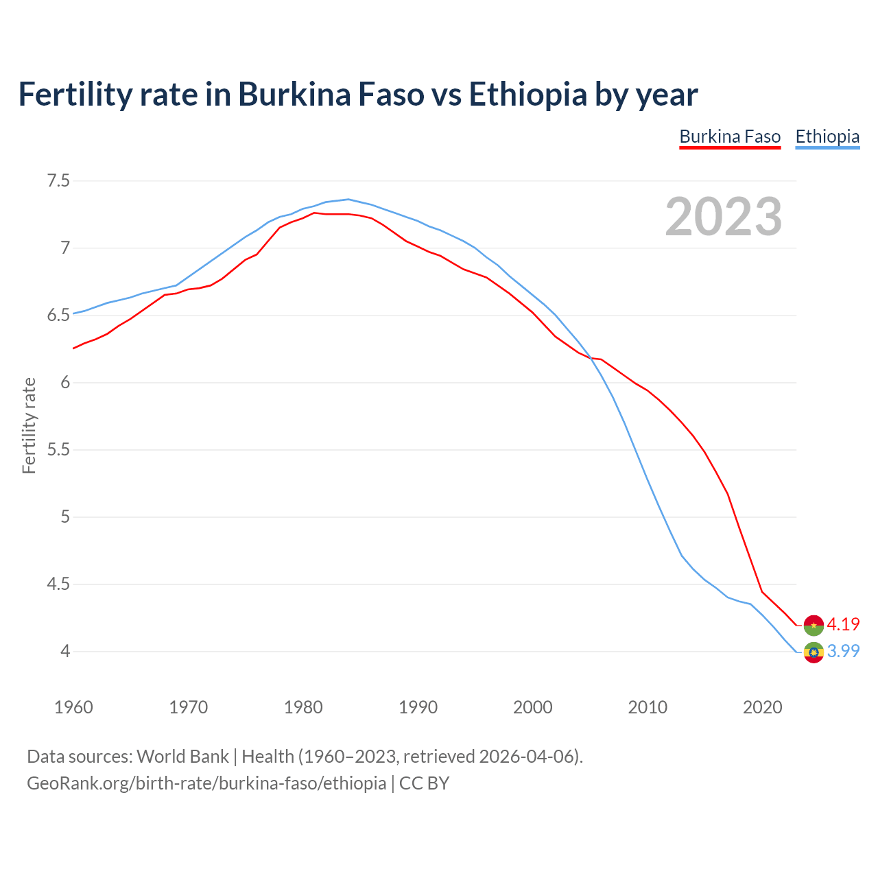 According to the latest available data on birth rates, the fertility rate in Burkina Faso was 4.19 children per woman in 2023, compared to 3.99 in Ethiopia in 2023. The replacement level is considered to be 2.1 children per woman.