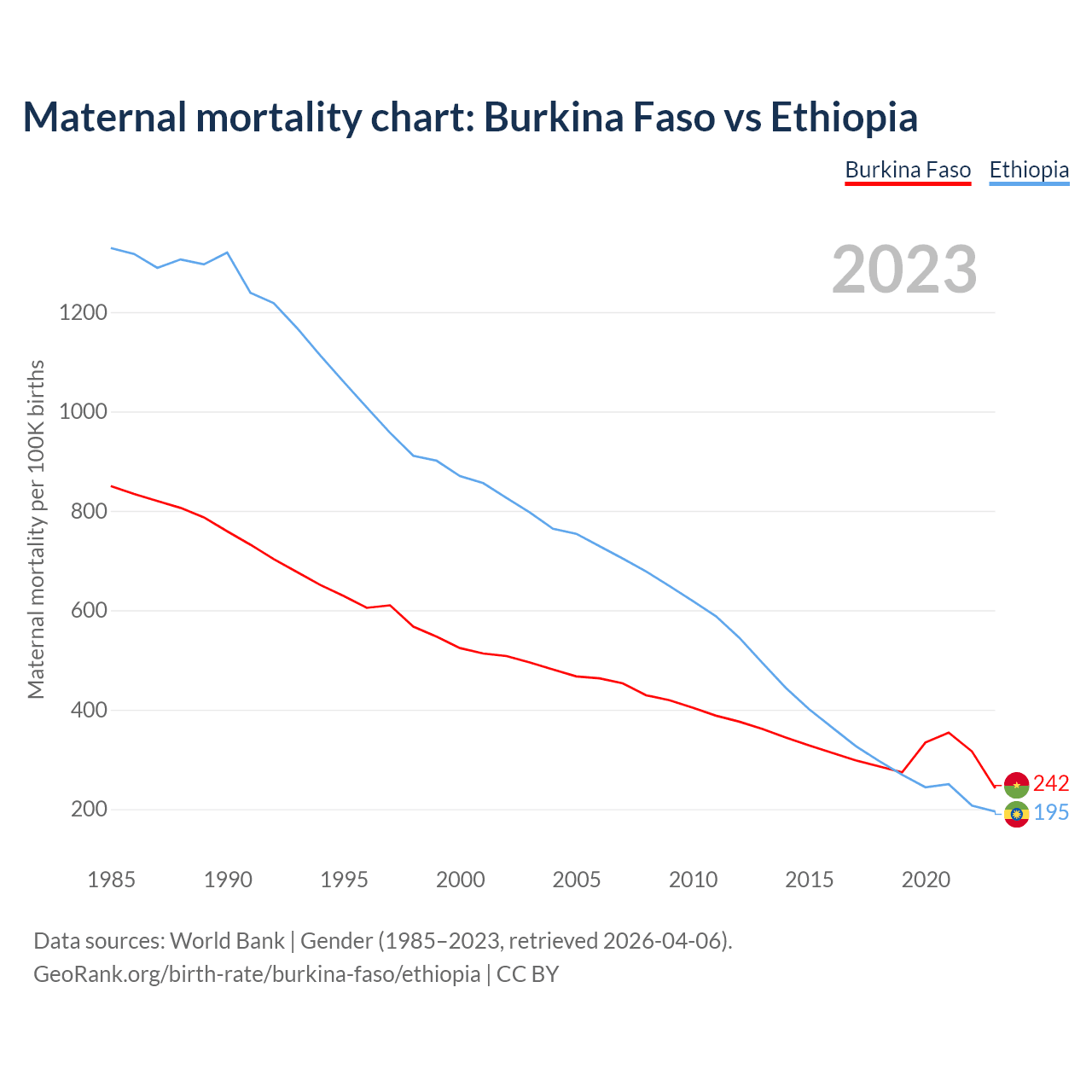 - Annual births per 1,000 women ages 15-19 (adolescent birth rate or teenage mother rate) is 87.1 in Burkina Faso vs 69.9 in Ethiopia.