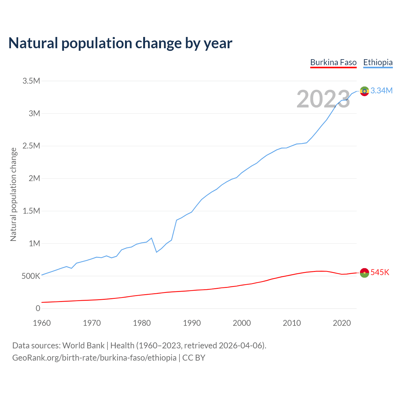 Burkina Faso has an annual birth rate of 31.6 births per 1,000 people, compared to 31.9 for Ethiopia. The average number of children a woman is expected to have during her lifetime — the fertility rate, is 4.19 in Burkina Faso and 3.99 in Ethiopia — 4.71% difference.