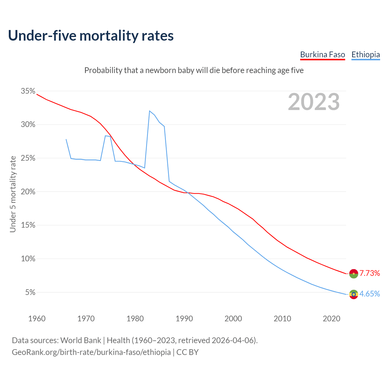 The chance that a newborn baby will die before reaching age five is 7.73% in Burkina Faso and 4.65% in Ethiopia. Above is a chart with historical data on under-five mortality rates.
