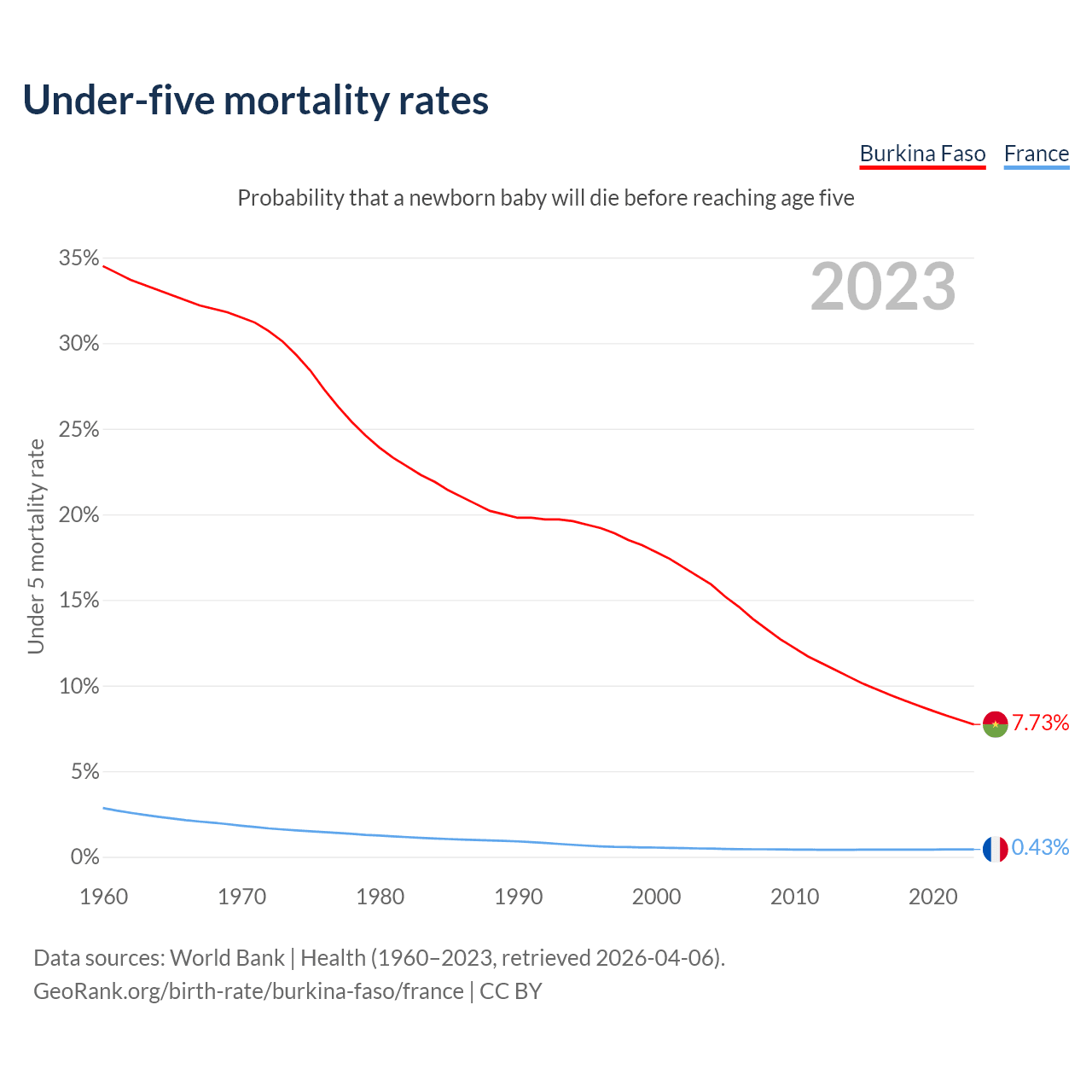 The chance that a newborn baby will die before reaching age five is 7.73% in Burkina Faso and 0.43% in France. Above is a chart with historical data on under-five mortality rates.