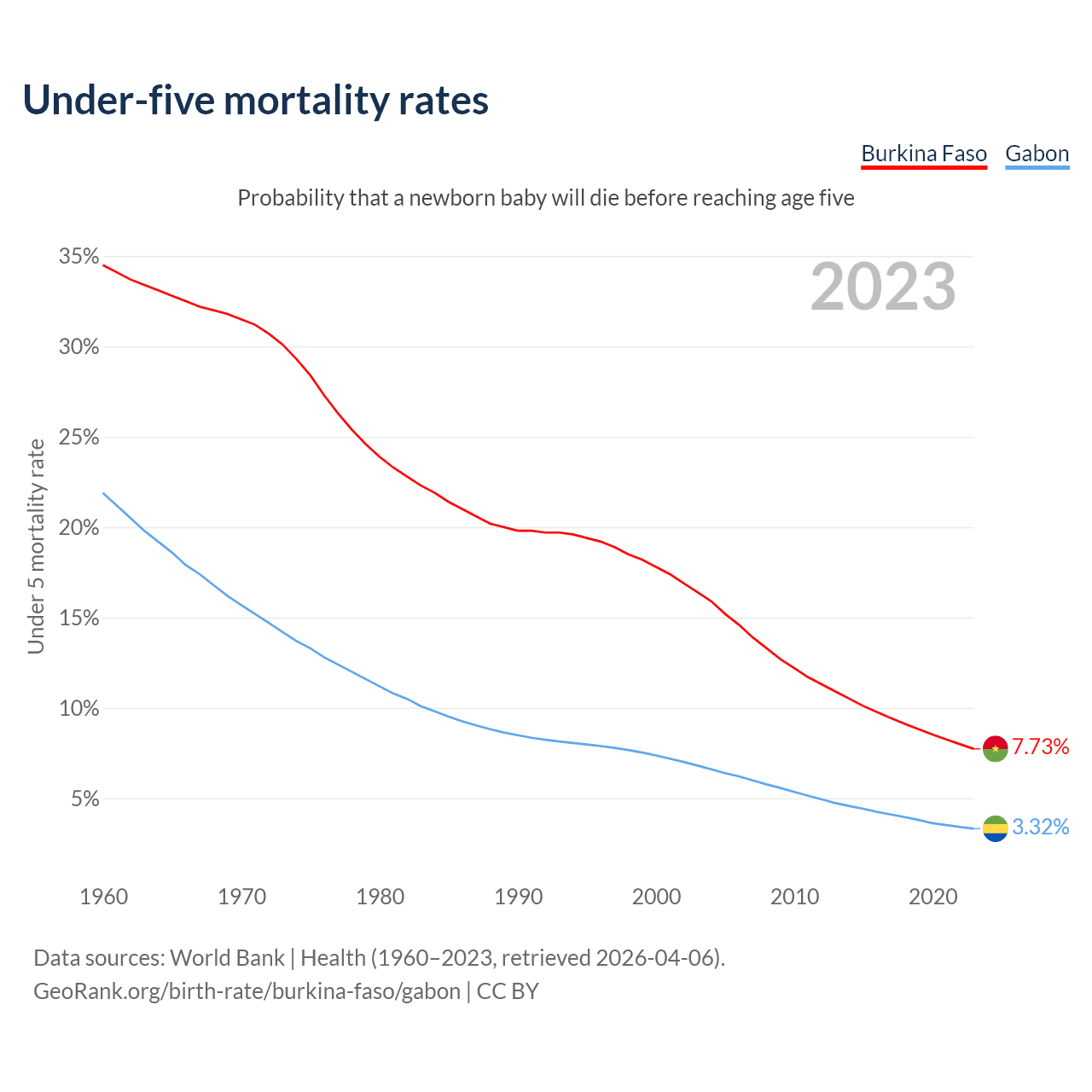 The chance that a newborn baby will die before reaching age five is 7.73% in Burkina Faso and 3.32% in Gabon. Above is a chart with historical data on under-five mortality rates.