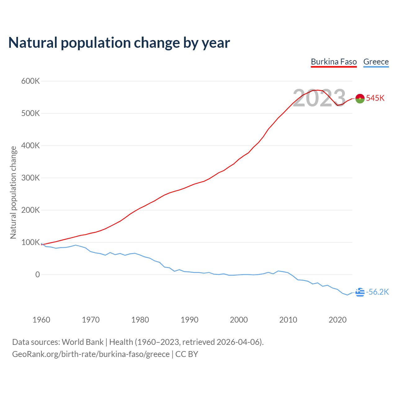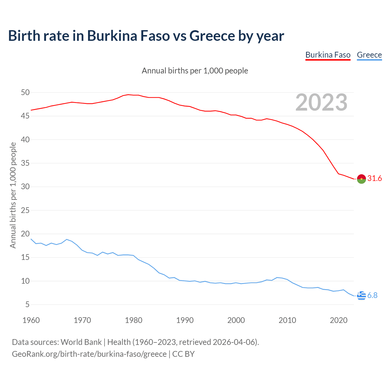 Burkina Faso has an annual birth rate of 31.6 births per 1,000 people, compared to 6.8 for Greece. The average number of children a woman is expected to have during her lifetime — the fertility rate, is 4.19 in Burkina Faso and 1.32 in Greece — 68.5% difference.