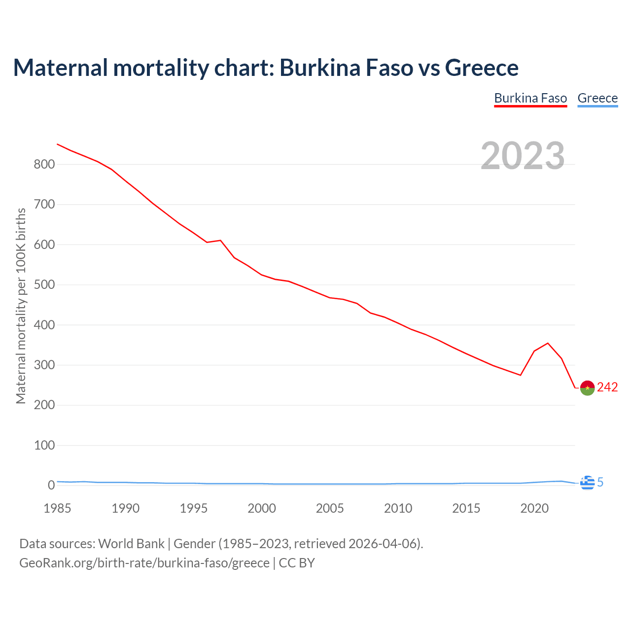 The maternal mortality rate, which is the probability of dying during childbirth or within 42 days of pregnancy termination, is 242 deaths per 100,000 live births in Burkina Faso, compared to 5 deaths in Greece.
