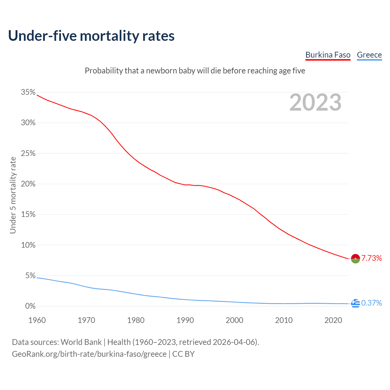 The chance that a newborn baby will die before reaching age five is 7.73% in Burkina Faso and 0.37% in Greece. Above is a chart with historical data on under-five mortality rates.