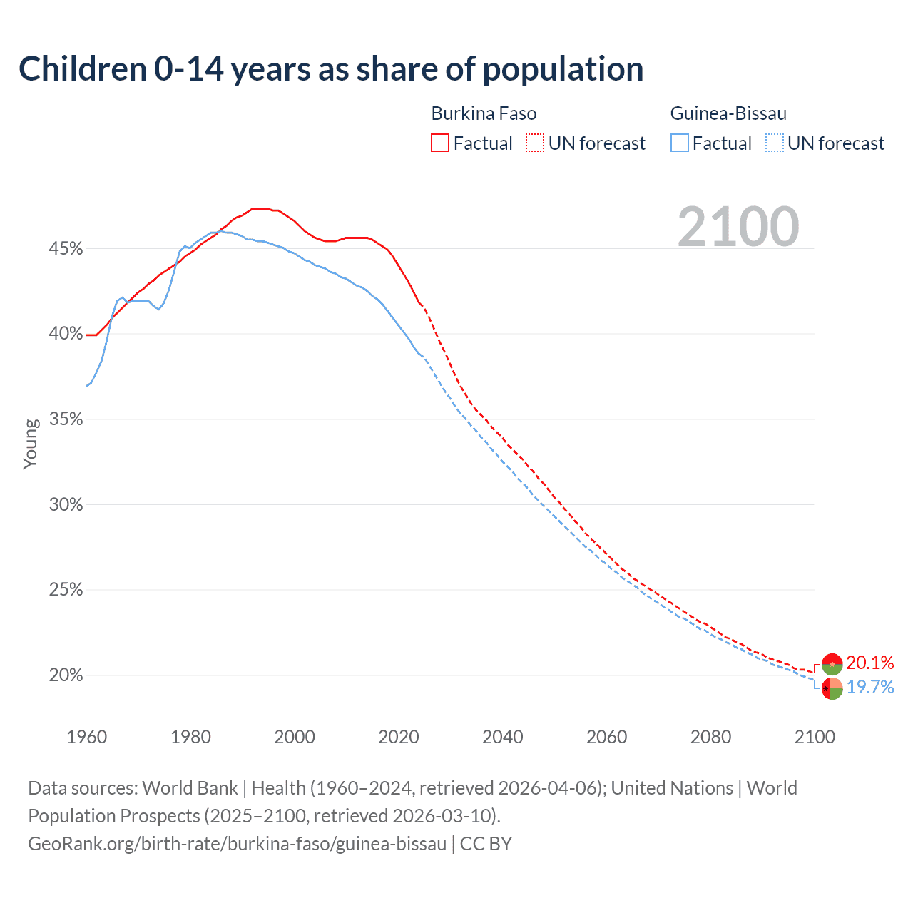 1960 vs 2023, the fertility rate has decreased by 33% in Burkina Faso and by 35.2% in Guinea-Bissau — in 1960, it was 6.25 and 5.92, respectively.