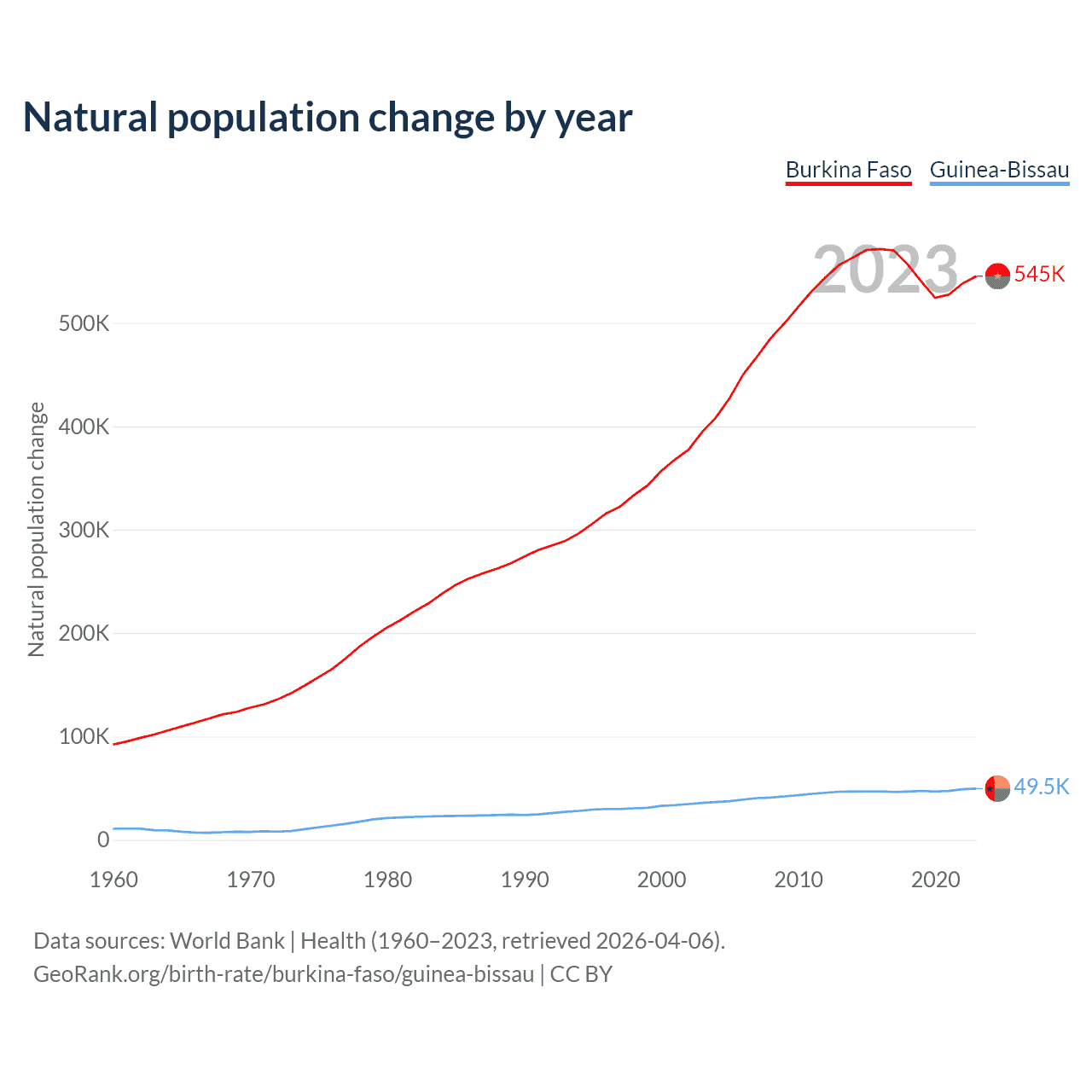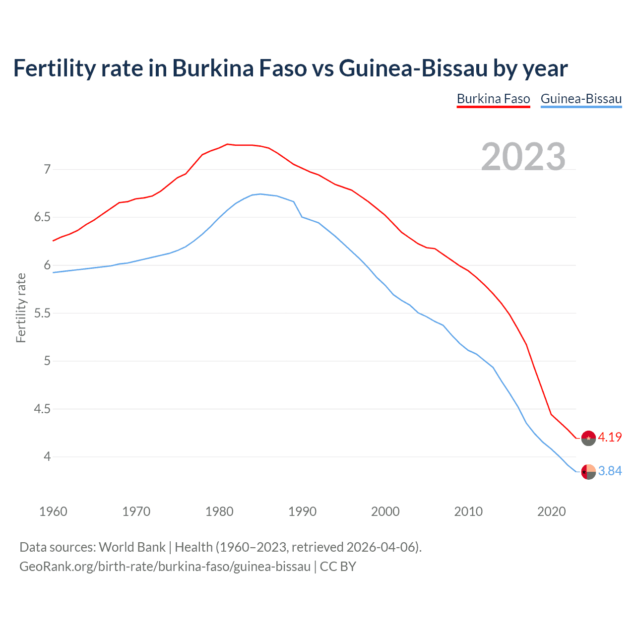 Burkina Faso has an annual birth rate of 31.6 births per 1,000 people, compared to 30 for Guinea-Bissau. The average number of children a woman is expected to have during her lifetime — the fertility rate, is 4.19 in Burkina Faso and 3.84 in Guinea-Bissau — 8.36% difference.