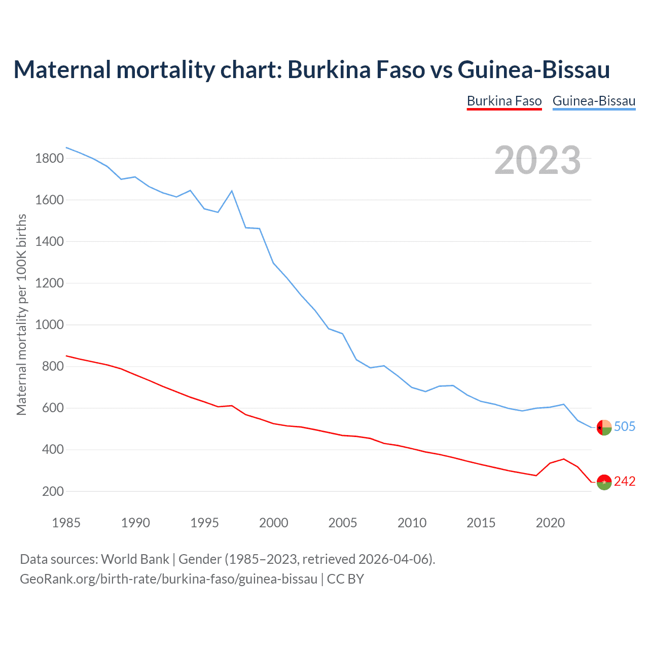 The maternal mortality rate, which is the probability of dying during childbirth or within 42 days of pregnancy termination, is 242 deaths per 100,000 live births in Burkina Faso, compared to 505 deaths in Guinea-Bissau.