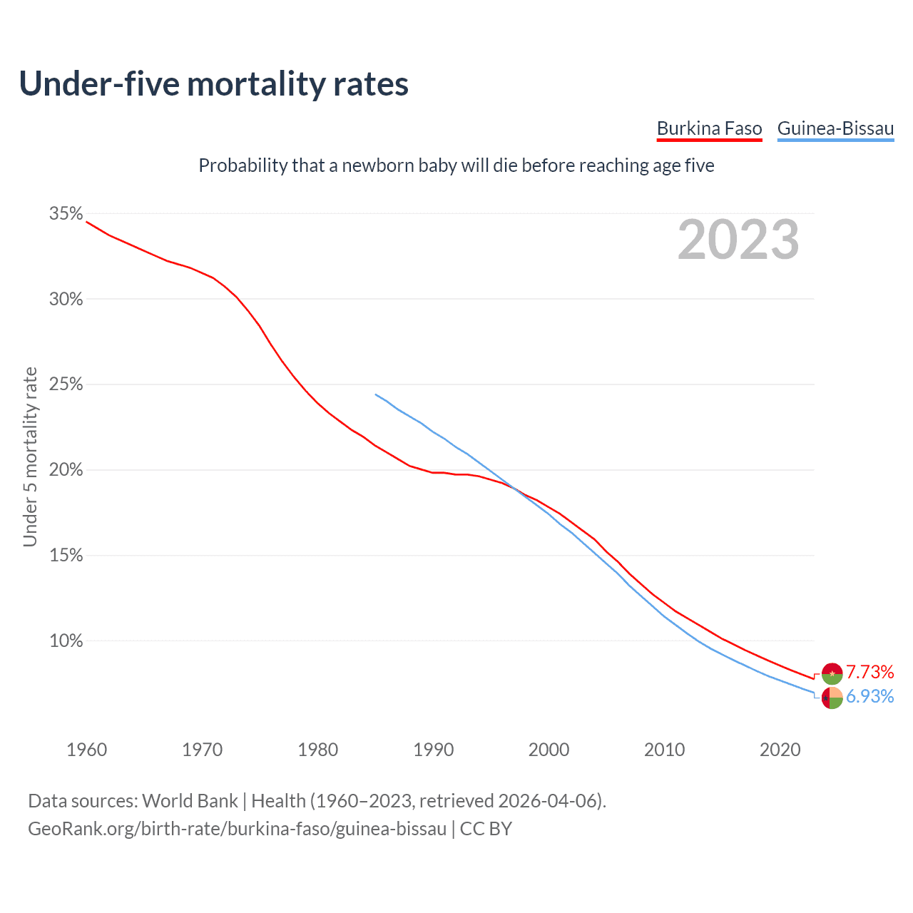 The chance that a newborn baby will die before reaching age five is 7.73% in Burkina Faso and 6.93% in Guinea-Bissau. Above is a chart with historical data on under-five mortality rates.