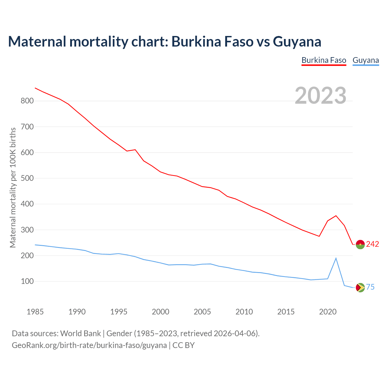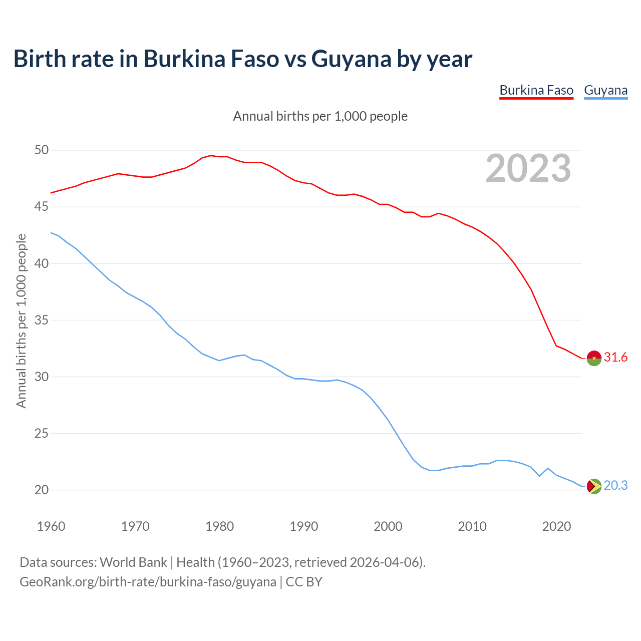 Burkina Faso has an annual birth rate of 31.6 births per 1,000 people, compared to 20.3 for Guyana. The average number of children a woman is expected to have during her lifetime — the fertility rate, is 4.19 in Burkina Faso and 2.41 in Guyana — 42.4% difference.