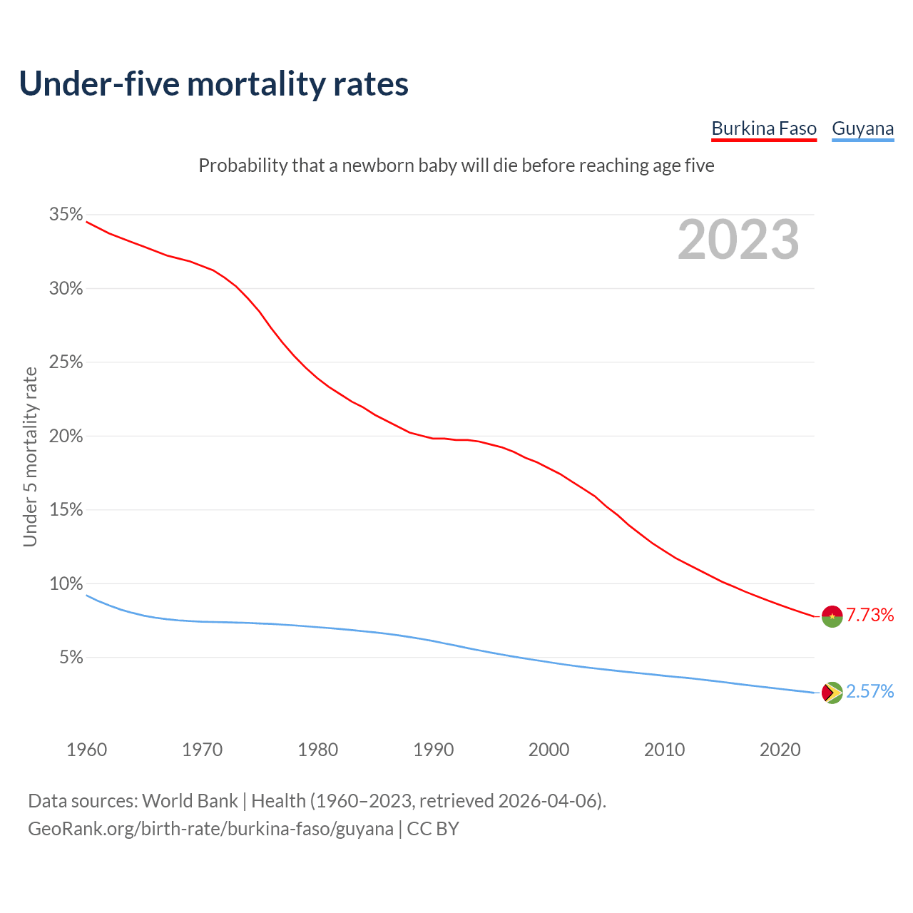 The chance that a newborn baby will die before reaching age five is 7.73% in Burkina Faso and 2.57% in Guyana. Above is a chart with historical data on under-five mortality rates.