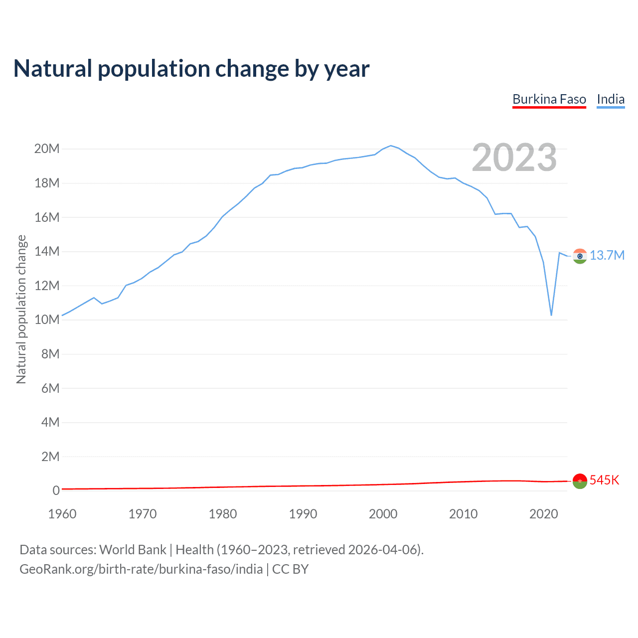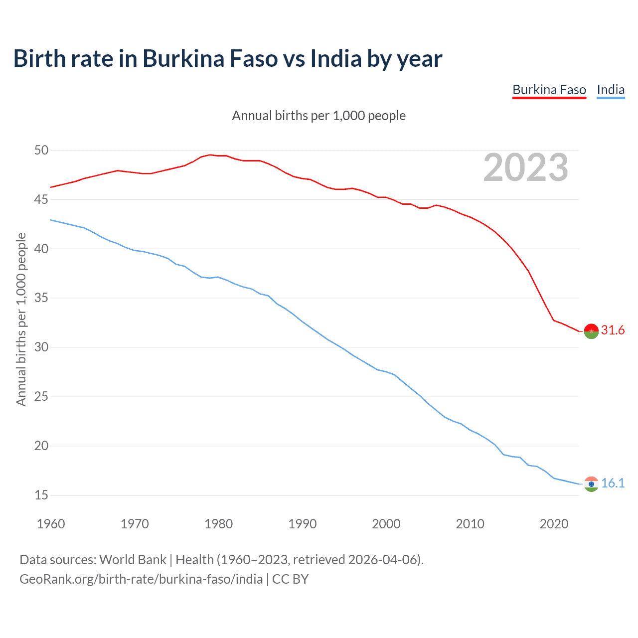 Burkina Faso has an annual birth rate of 31.6 births per 1,000 people, compared to 16.1 for India. The average number of children a woman is expected to have during her lifetime — the fertility rate, is 4.19 in Burkina Faso and 1.98 in India — 52.8% difference.