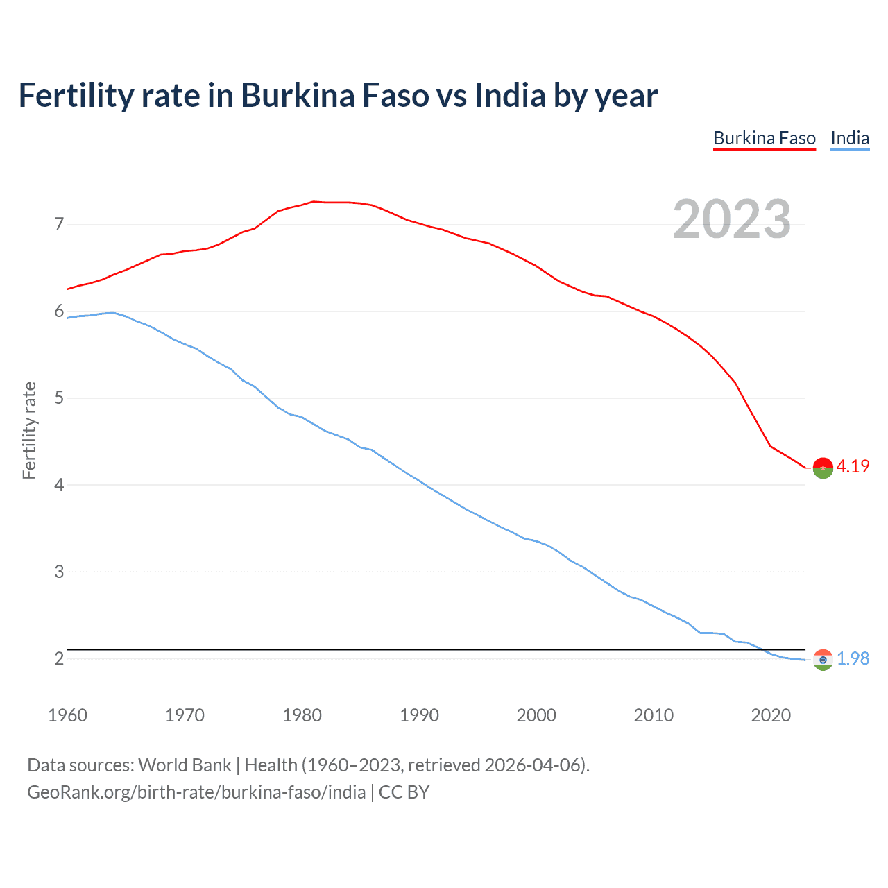 According to the latest available data on birth rates, the fertility rate in Burkina Faso was 4.19 children per woman in 2023, compared to 1.98 in India in 2023. The replacement level is considered to be 2.1 children per woman.