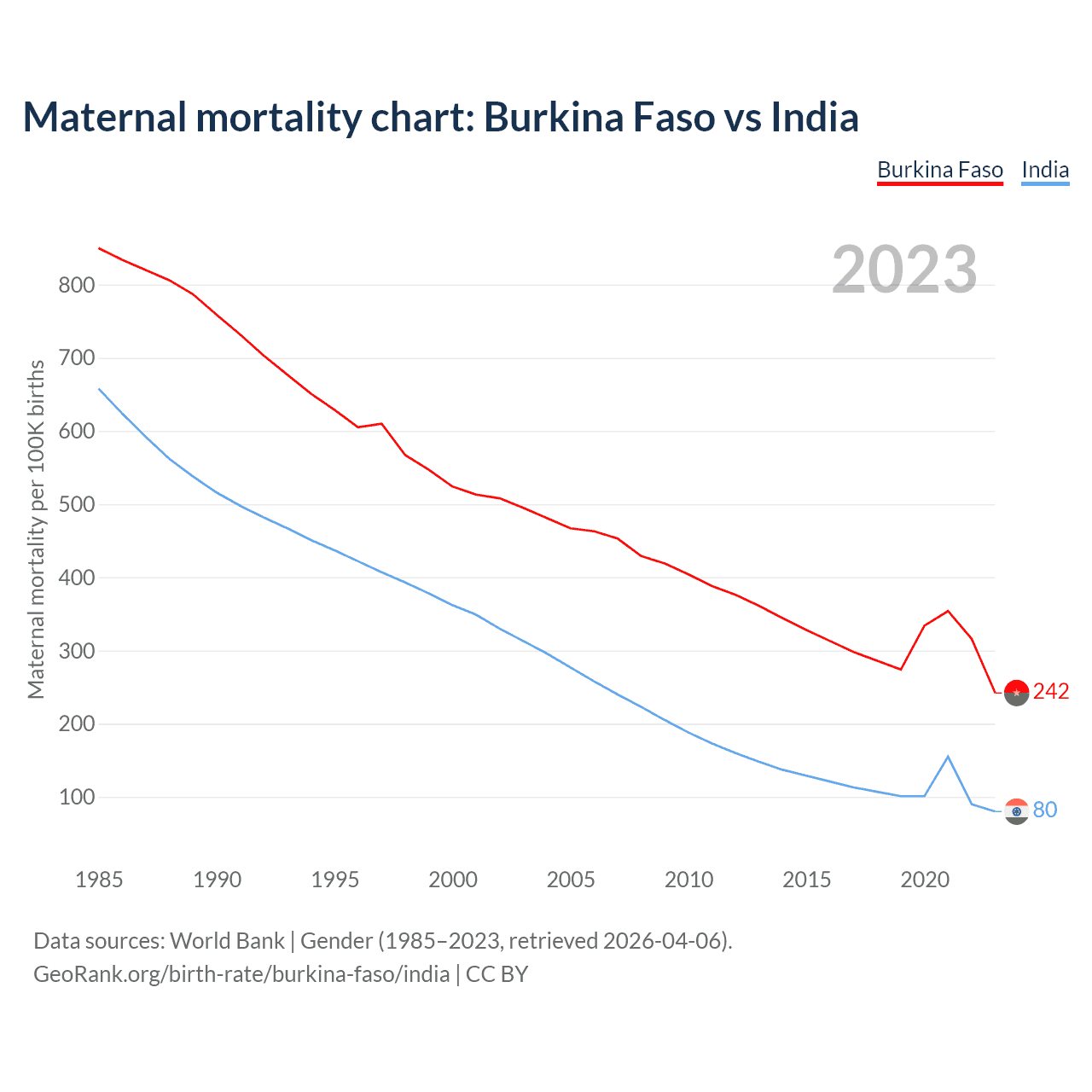 The maternal mortality rate, which is the probability of dying during childbirth or within 42 days of pregnancy termination, is 242 deaths per 100,000 live births in Burkina Faso, compared to 80 deaths in India.
