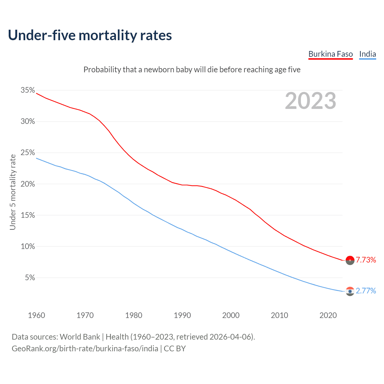 The chance that a newborn baby will die before reaching age five is 7.73% in Burkina Faso and 2.77% in India. Above is a chart with historical data on under-five mortality rates.