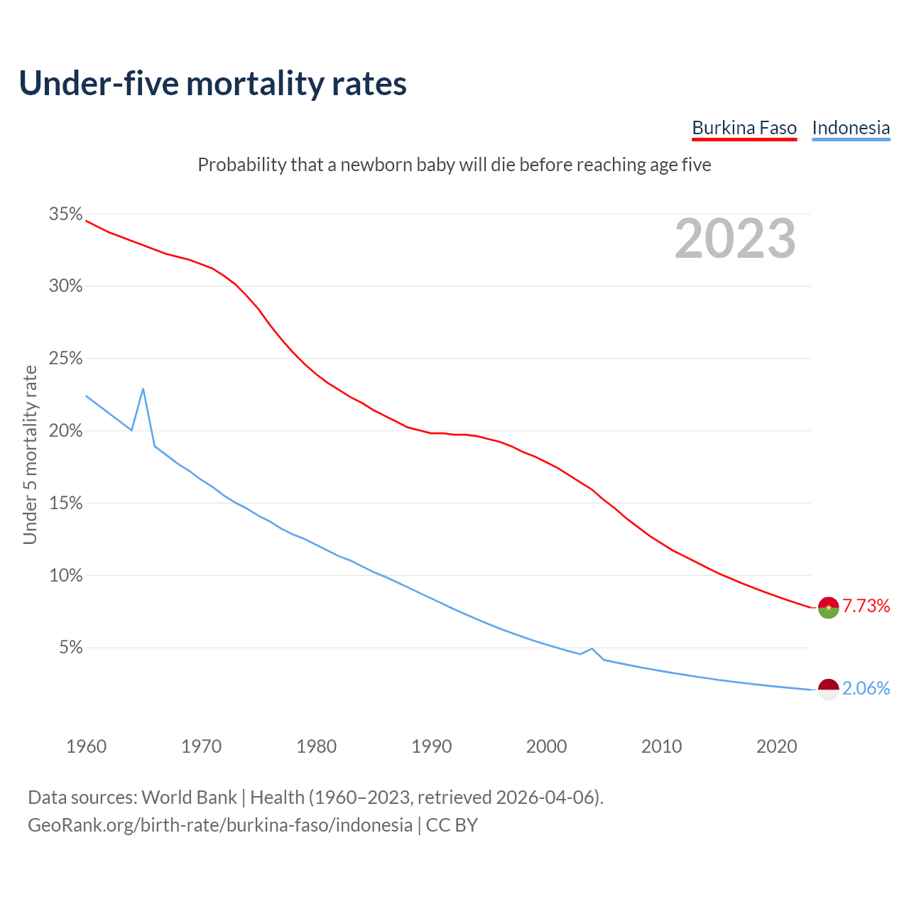 The chance that a newborn baby will die before reaching age five is 7.73% in Burkina Faso and 2.06% in Indonesia. Above is a chart with historical data on under-five mortality rates.