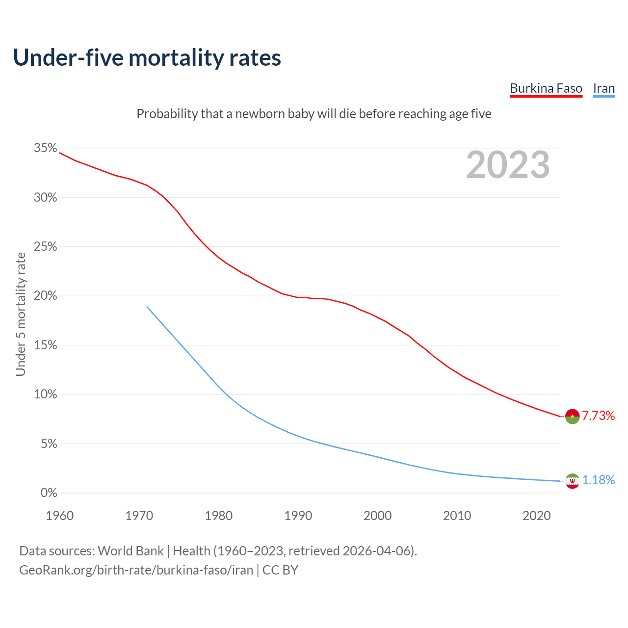 The chance that a newborn baby will die before reaching age five is 7.73% in Burkina Faso and 1.18% in Iran. Above is a chart with historical data on under-five mortality rates.
