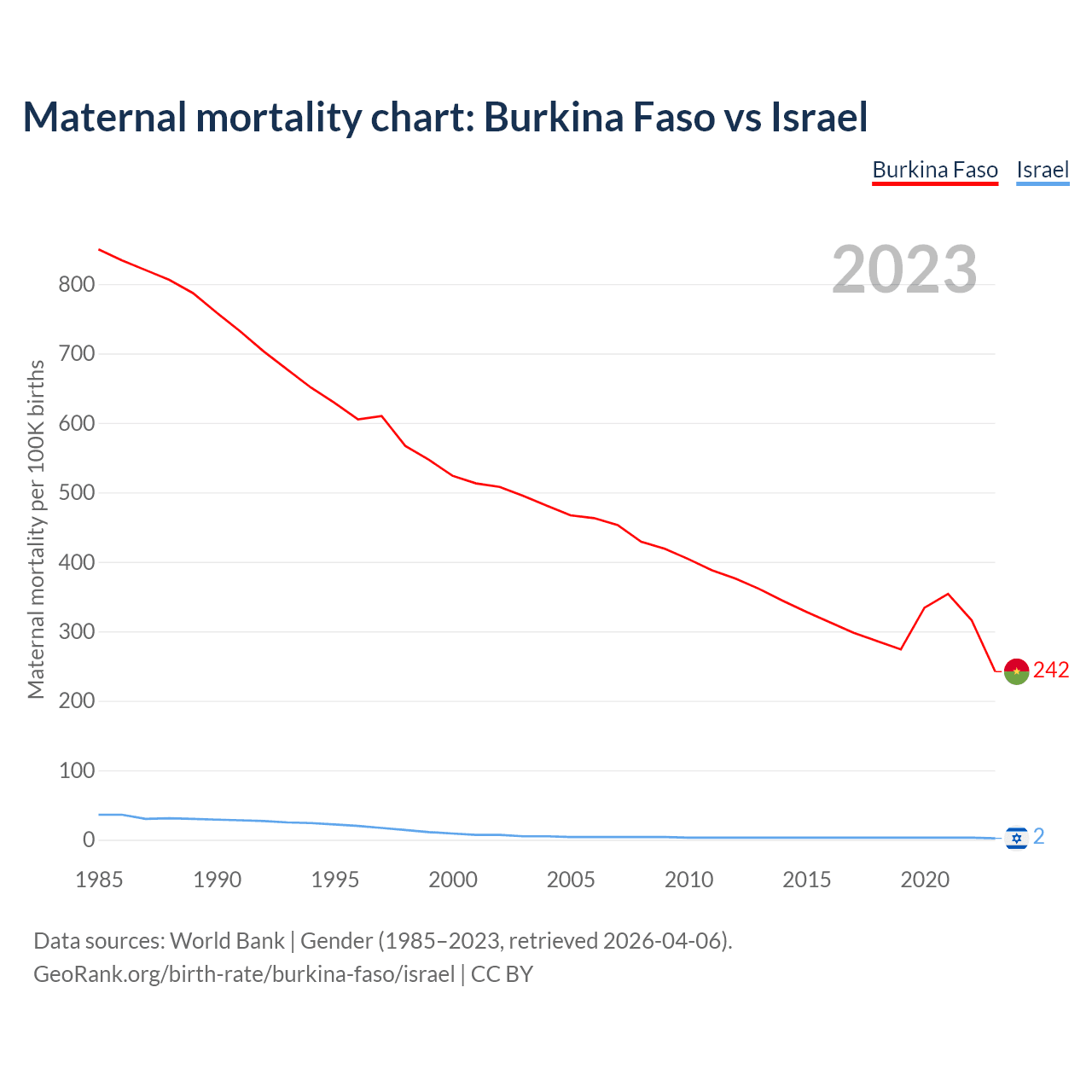 The maternal mortality rate, which is the probability of dying during childbirth or within 42 days of pregnancy termination, is 242 deaths per 100,000 live births in Burkina Faso, compared to 2 deaths in Israel.